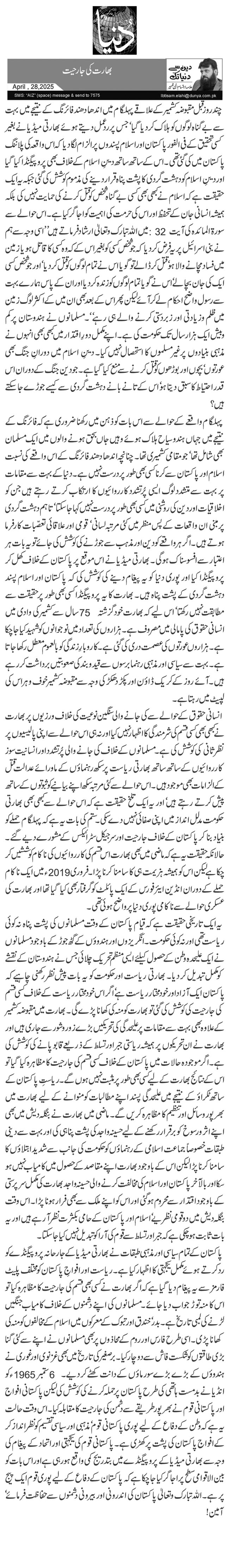 یہ ایک تاریخی حقیقت ہے کہ قیام پاکستان کے وقت مسلمانوں کی پشت پناہ نہ کوئی ریاست تھی اور نہ کوئی حکومت۔ انگریزوں اور ہندوئوں کے گٹھ جوڑ کے باوجود مسلمانوں نے ایک علیحدہ وطن کے حصول کیلئے ایسی منظم تحریک چلائی جس نے ہندوستان کے نقشے کو مکمل تبدیل کر دیا۔ بھارتی ریاست اور حکومت کو یہ بات پیش نظر رکھنی چاہیے کہ پاکستان ایک آزاداور خودمختار ریاست ہے‘ اگر اس خودمختار ریاست کے خلاف کسی قسم کی جارحیت کی کوشش کی گئی تو بھارت کو منہ کی کھانا پڑے گی۔ بھارت میںمقبوضہ کشمیر کے علاوہ بھی بہت سے مقامات پر علیحدگی کی تحریکیں بڑے زور وشور سے جاری ہیں اور بھارت نے ان تحریکوں پر ہمیشہ ریاستی جبر اور تسلط کے ذریعے قابو پانے کی کوشش کی ہے۔ اگر موجودہ حالات میں پاکستان کے خلاف کسی قسم کی جارحیت کا مظاہرہ کیا گیا تو اس کے نتائج بھارت کے لیے کسی بھی طور پر مثبت نہیں ہوں گے۔ ریاستِ پاکستان کے ساتھ ٹکرائو کے نتیجے میں علیحدگی پسند اپنے مطالبات کو منوانے کے لیے بھارت میں بھرپور وسائل اور تنظیم کا مظاہرہ کریں گے۔ ماضی میں بھارت نے بنگلہ دیش میں بھی اپنے اثر ورسوخ کو برقرار رکھنے کے لیے حسینہ واجدکی پشت پناہی کی اور بہت سے دینی طبقات خصوصاً جماعت اسلامی کے رہنمائوں کو حکومت کی جانب سے شدید ابتلائوں کا سامنا کرنا پڑا لیکن اس کے باوجود بھارت اپنے مقاصد کے حصول میں کامیاب نہیں ہو سکا اور بالآخر پاکستان اور اسلام کی مخالفت کرنے والی حسینہ واجد بھارت کی مکمل سرپرستی کے باوجود اقتدار سے محروم ہو گئی اور اس کو اپنے ملک سے بھی فرار ہونا پڑا۔ اس وقت بنگلہ دیش میں دو قومی نظریے‘ اسلام اور پاکستان کے حامی بکثرت نظر آ رہے ہیں اور یہ بات ثابت ہو چکی ہے کہ جبر اور تسلط سے قوم کی آرا کو تبدیل نہیں کیا جا سکتا۔