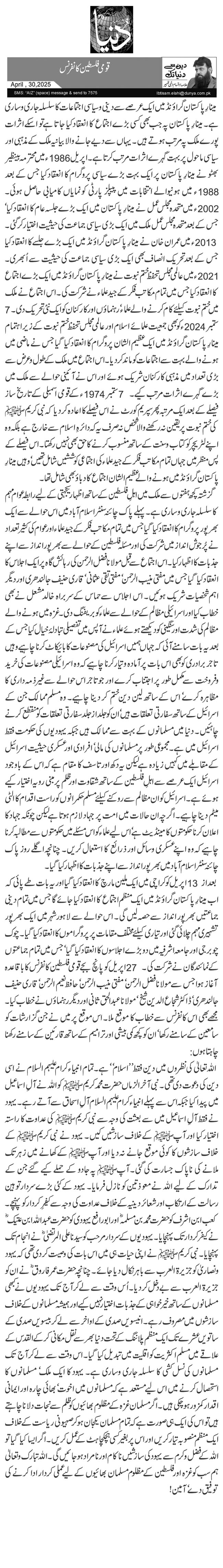 بعد از 13 اپریل کو کراچی میں ایک ملین مارچ کا انعقاد کیا گیا اور یہ بات طے پائی کہ اب مینارِ پاکستان گرائونڈ میں ایک منظم اجتماع کا انعقاد کیا جائے گا جس میں تمام دینی جماعتیں بھرپور انداز سے حصہ لیں گی۔ اس حوالے سے لاہور شہر میں ایک بھرپور تشہیری مہم چلائی گئی اور تیاری کیلئے مختلف مقامات پر پروگراموں کا انعقاد کیا گیا۔ چوک چوبرجی اور جامعہ اشرفیہ میں دو بڑے اجلاسوں کا انعقاد کیا گیا‘ جس میں تمام جماعتوں کے نمائندگان نے شرکت کی۔ 27 اپریل کو پانچ بجے قومی فلسطین کانفرنس کا باقاعدہ آغاز ہوا جس سے مولانا فضل الرحمن‘ مفتی منیب الرحمن‘ حافظ نعیم الرحمن‘ قاری حنیف جالندھری‘ ڈاکٹر شجاع الدین شیخ‘ مولانا عبدالحق ثانی اور دیگر رہنمائوں نے خطاب کیا۔ مجھے بھی اس کانفرنس سے خطاب کا موقع ملا۔ اس موقع پر میں نے جن گزارشات کو سامعین کے سامنے رکھا‘ ان کو کچھ کمی بیشی اور ترامیم کے ساتھ قارئین کے سامنے رکھنا چاہتا ہوں: