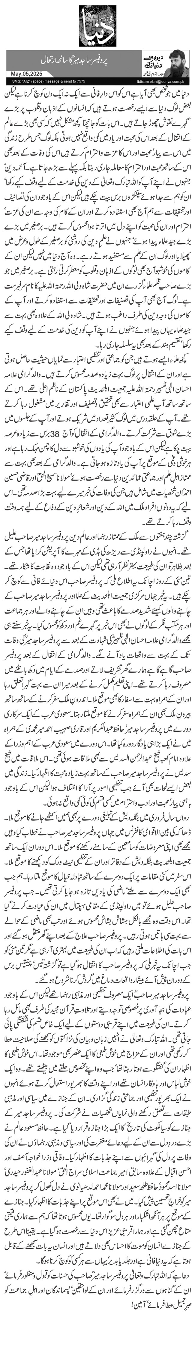 دعا ہے کہ اللہ تبارک وتعالیٰ پروفیسر ساجد میرؒ صاحب کی حسنات کو قبول ومنظور فرمائے‘ ان کے گناہوں سے درگزر فرمائے اور ان کے لواحقین‘ پسماندگان اور اہلِ جماعت کو صبرِ جمیل عطا فرمائے‘ آمین!
