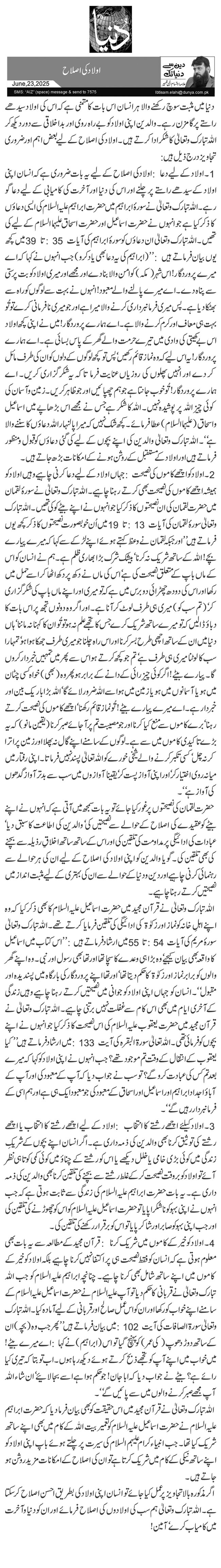 اگر مذکورہ بالا تجاویز پر عمل کیا جائے تو انسان اپنی اولاد کی بطریق احسن اصلاح کر سکتا ہے۔ اللہ تبارک وتعالیٰ ہم سب کی اولادوں کی اصلاح فرمائے اور ان کو دنیا وآخرت میں کامیاب کرے‘ آمین!