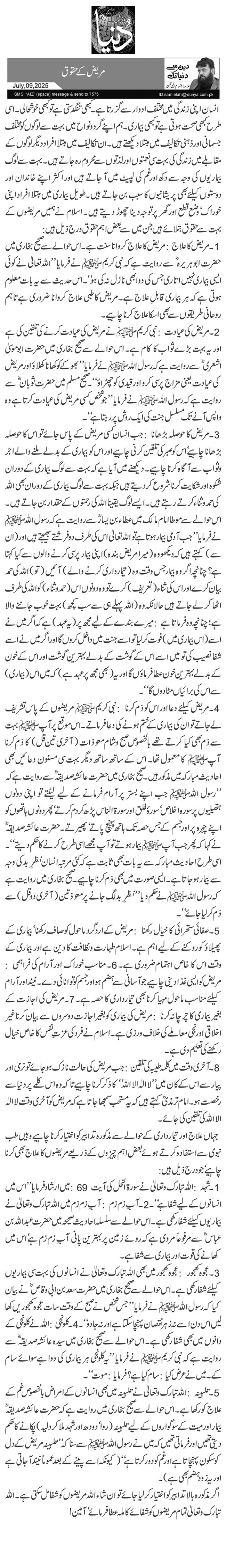 1۔ مریض کا علاج: مریض کا علاج کروانا سنت ہے۔ اس حوالے سے صحیح بخاری میں حضرت ابوہریرہؓ سے روایت ہے کہ نبی کریمﷺ نے فرمایا ''اللہ تعالیٰ نے کوئی ایسی بیماری نہیں اتاری جس کی دوا بھی نازل نہ کی ہو‘‘۔ اس حدیث سے یہ بات معلوم ہوتی ہے کہ ہر بیماری قابلِ علاج ہے۔ مریض کا طبی علاج کروانا ضروری ہے تاہم روحانی طریقوں سے بھی اسکا علاج کرنا چاہیے۔