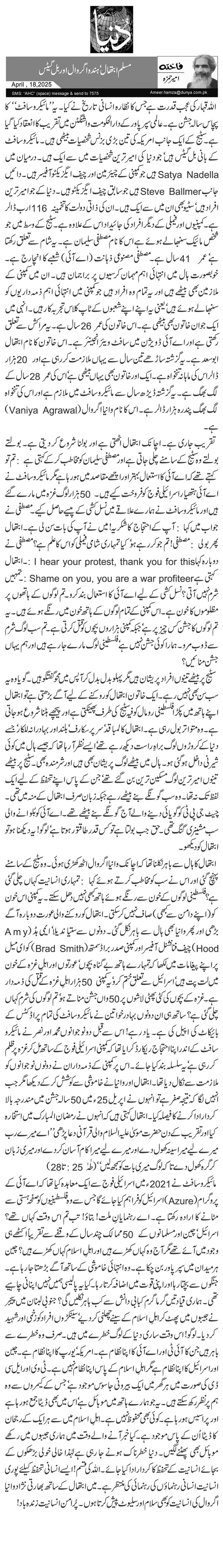 ابتھال کا ہال سے باہر نکلنا تھا کہ اچانک وانیا اگروال اٹھ کھڑی ہوئی۔ وہ سٹیج کے سامنے پہنچ گئی اور اس نے سب کو مخاطب کرتے ہوئے کہا: تمہاری انسانیت کہاں چلی گئی ہے؟ فلسطینی لوگوں کے خون سے رنگے ہوئے ہاتھ کبھی نہیں دھل سکتے۔ یہ کمپنی اس خون کو (اپنے دامن سے کبھی) صاف نہیں کر سکتی۔ ابتھال کو روکنے والی عورت دوبارہ آگے بڑھی اور پھر وانیا بھی ہال سے باہر نکل گئی۔ دونوں سے ستیا ندیلا‘ ایمی ہڈ (Amy Hood) چیف فنانشنل آفیسر اور کمپنی صدربراڈ سمتھ (Brad Smith) کو ای میل پر اپنے پیغامات میں لکھا کہ تمہارے ہاتھ بے گناہ بچوں‘ عورتوں اور اہلِ غزہ کے خون میں لت پت ہیں‘ اسرائیل سے تعلق ختم کرو‘ یہ کمپنی 50 ہزار اہلِ غزہ کے قتل کی ذمہ دار ہے۔ غزہ کے بچوں کی کٹی پھٹی لاشوں پر 50واں جشن مناتے ہو‘ تم لوگوں کی شرم کہاں چلی گئی ہے؟ ساتھ ہی ان دونوں بہادر خواتین نے مائیکرو سافٹ کی تمام پراڈکٹس کے بائیکاٹ کی اپیل کی ہے۔ یاد رہے! اس سے قبل دو نوجوانوں محمد اور نصر نے مائیکرو سافٹ کے اندر اپنا احتجاج ریکارڈ کرایا تھا کہ کمپنی اسرائیلی فوج کے ساتھ مل کر غزہ پر ظلم کر رہی ہے‘ یہ سلسلہ بند کیا جائے۔ اس پر کمپنی کے ذمہ داران نے دونوں نوجوانوں کو ملازمت سے نکال دیا تھا۔ ابتھال اور وانیا نے خاموشی سے کوشش کر کے دیکھا مگر جب انہیں لگا کہ نتیجہ صفر ہے تو انہوں نے اپریل 25ء میں 50سالہ جشن میں مندرجہ بالا کردار ادا کرنے کا فیصلہ کیا۔ ابتھال کہتی ہیں کہ انہوں نے رمضان المبارک میں استخارہ کیا اور تقریب کے دن حضرت موسیٰ علیہ السلام والی قرآنی دعا پڑھی '' اے میرے رب میرے لیے میرا سینہ کھول دے اور میرے لیے میرا کام آسان کر دے اور میری زبان کر گرہ کھول دے تاکہ لوگ میری بات کو سمجھ لیں ‘‘(طٰہٰ: 25 تا 28)