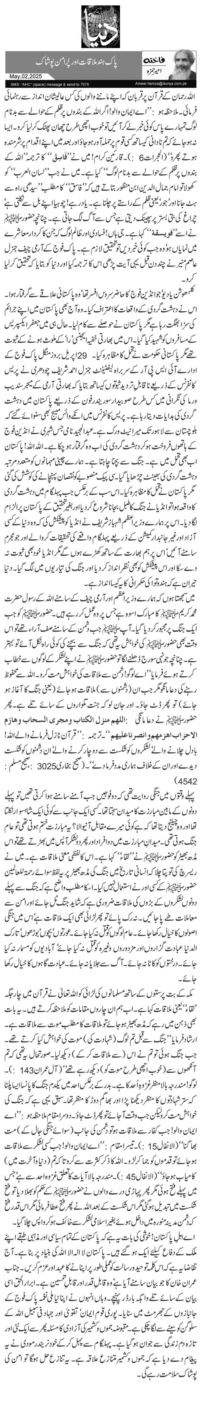 اے اہلِ پاکستان! خوشی کی بات یہ ہے کہ پاکستان کے تمام سیاسی اور مذہبی طبقے اپنے ملک کے دفاع کیلئے ایک ہو گئے ہیں۔ پاکستان لا الہ الا اللہ کی بنیاد پر بنا ہے۔ آج تقاضا یہ ہے کہ اس کلمہ توحید ورسالت کو عملی طور پر اپنانے کا عہد اور عزم کریں۔ جناب عمران خان کا جو بیان سامنے آیا ہے‘ وہ قابلِ قدر اور قابلِ تحسین ہے۔ ابرار الحق اسی بیان کے سائے تلے واہگہ بارڈر پہنچے۔وہاں انہوں نے اپنا نیا ملی نغمہ پاک فوج کے جانبازوں کے جھرمٹ میں سنایا۔ پوری قوم ایمان‘ تقویٰ اور جہاد فی سبیل اللہ کے سلوگن کو سینے سے لگا چکی ہے۔ مقبوضہ جموں وکشمیر کی آزادی کا مسئلہ پھر سے ایک نئی اور تازہ دم زندگی سے جوان ہو گیا ہے۔ پہلگام سے پہل کرکے خود نریندر مودی نے یہ پیغام دے دیا ہے کہ جموں وکشمیر متنازع علاقہ ہے۔ یہ تنازع حل ہوگا تو امن کی پوشاک سلامت رہے گی۔