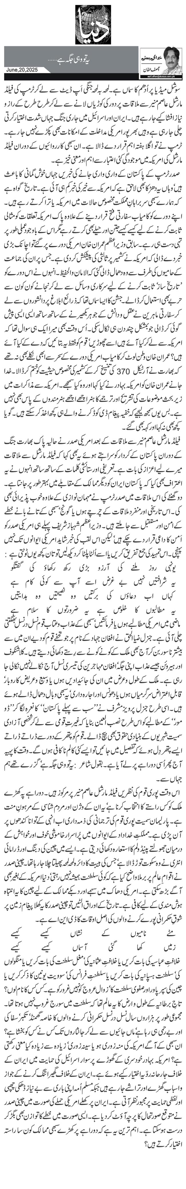 سوشل میڈیا پر اُدھم کا سماں ہے۔ لمحہ بہ لمحہ جنگی اَپ ڈیٹ سے لے کر ٹرمپ کی فیلڈ مارشل عاصم منیر سے ملاقات پر دور کی کوڑیاں لانے سے لے کر طرح طرح کے راز و نیاز افشا کیے جا رہے ہیں۔ ایران اور اسرائیل میں جاری جنگ جہاں شدت اختیار کرتی چلی جا رہی ہے وہیں بھرپور امریکی مداخلت کے امکانات بھی پکڑے نہیں جا رہے۔ ٹرمپ نے تو اگلا ہفتہ اہم قرار دے ڈالا ہے۔ ان سبھی کارروائیوں کے دوران فیلڈ مارشل کی امریکہ میں موجودگی کئی اعتبار سے اہم اور معنی خیز ہے۔