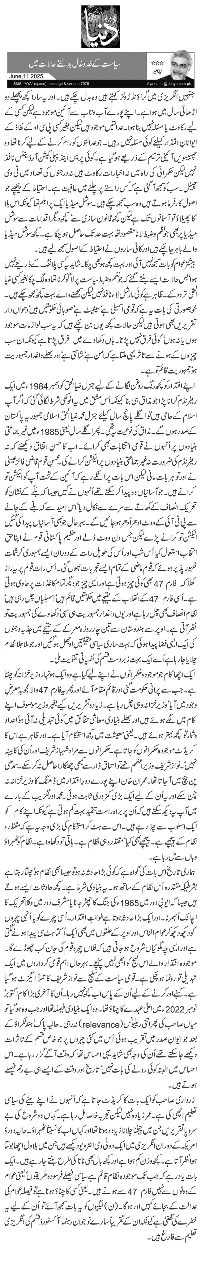 ہماری تاریخ اس بات کی گواہ ہے کہ کوئی بڑا حادثہ نہ ہو تو جیسا بھی نظام ہو‘ چلتا رہتا ہے بشرطیکہ مقتدرہ اُس نظام کے ساتھ ہو۔ یہ بنیادی شرط ہے۔ کچھ حادثات ایسے ہوتے ہیں جیسا کہ ایوبی دور میں 1965ء کی جنگ کا چھڑ جانا یا مشرف دور میں وکلا تحریک کا اچانک اُبھرنا۔ اور ایک بڑا حادثہ ہوتا ہے طوالتِ اقتدار۔ اُسی چہرے کو یا اُنہی چہروں کو دیکھ دیکھ کر عوام الناس اور اوپر کے حلقوں میں بھی ایک اُکتاہٹ سی پیدا ہونے لگتی ہے اور ایسی چہ مگوئیاں شروع ہو جاتی ہیں کہ فلاں چہرہ قوم کی جان کب چھوڑے گا۔ موجودہ اقتدار والے اس نہج کو ابھی نہیں پہنچے۔ بہرحال اہم قومی کرداروں میں ایک تبدیلی تو رونما ہو چکی ہے۔ قومی سیاست کے سٹیج سے نواز شریف کا عملاً ایگزٹ ہو گیا ہے۔ کہنے اور کرنے کے لیے اُن کے پاس اب کچھ نہیں رہا۔ اُن کا آخری بڑا کام اکتوبر‘ نومبر 2022ء میں اعلیٰ عہدے کا چناؤ تھا۔ وہ ایک بنیادی فیصلہ تھا اور جب وہ ہو گیا تو میاں صاحب کی پھر اتنی ریلیونس (relevance) نہ رہی۔ حالیہ پاک‘ ہند ٹکراؤ کے بعد جو ایوانِ صدر میں تقریب ہوئی اُس میں کئی چہروں پر جو خاص قسم کے تاثرات دیکھے جا سکتے تھے اُن کی وجہ بھی شاید یہی احساس تھا کہ وقت آگے گزر رہا ہے۔ اس احساس میں البتہ کوئی رونے کی بات نہیں‘ تاریخ اور وقت کے ایسے ہی بے رحم فیصلے ہوتے ہیں۔