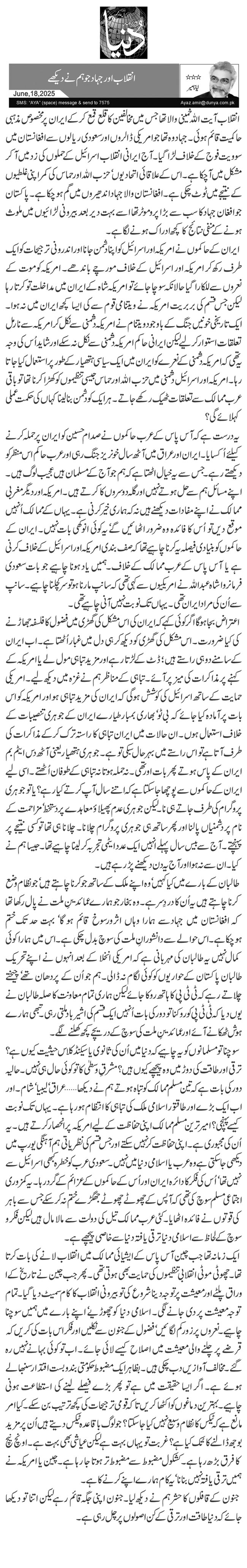 انقلاب آیت اللہ خمینی والا تھا جس میں مخالفین کا قلع قمع کرکے ایران پر مخصوص مذہبی حاکمیت قائم ہوئی۔ جہاد وہ تھا جو امریکی ڈالروں اور سعودی ریالوں سے افغانستان میں سوویت فوج کے خلاف لڑا گیا۔ آج ایرانی انقلاب اسرائیل کے حملوں کی زد میں آکر مشکل میں آچکا ہے۔ اس کے علاقائی اتحادیوں‘ حزب اللہ اور حماس کی کمر اپنی غلطیوں کے نتیجے میں ٹوٹ چکی ہے۔ افغانستان والا جہاد اندھیروں میں گم ہوچکا ہے۔ پاکستان جو افغان جہاد کا سب سے بڑا پروموٹر تھا اسے بہت دیر بعد بیرونی لڑائیوں میں ملوث ہونے کے منفی نتائج کا کچھ ادراک ہونے لگا ہے۔