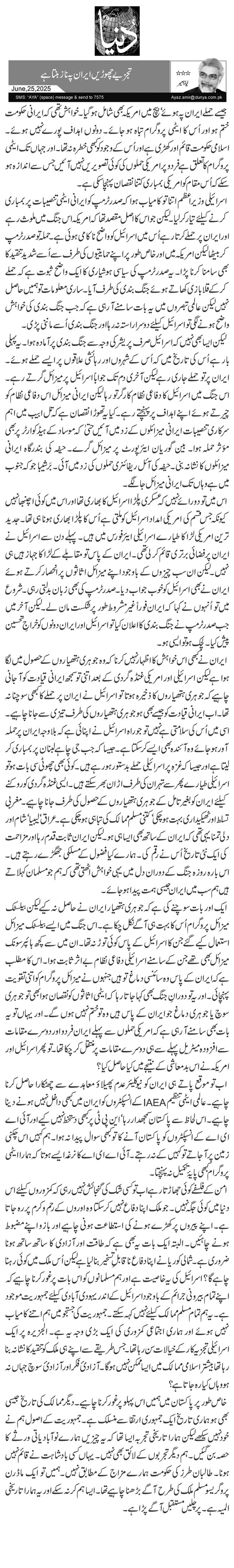 اس میں تو دو رائے نہیں کہ عسکری پلڑا اسرائیل کا بھاری تھا اور اس میں کوئی اچنبھا نہیں کیونکہ جس قسم کی امریکی امداد اسرائیل کو ملتی ہے اُس کا پلڑا بھاری ہونا ہی تھا۔ جدید ترین امریکی لڑاکا طیارے اسرائیلی ایئرفورس میں ہیں۔ پہلے دن سے اسرائیل نے ایران پر فضائی برتری قائم کر لی تھی۔ ایران کے پاس تو مقابلے کے لڑاکا جہاز ہیں ہی نہیں۔ لیکن ان سب چیزوں کے باوجود اپنے میزائل اثاثوں پر انحصار کرتے ہوئے ایران نے بھی اسرائیل کو خوب جواب دیا۔ صدر ٹرمپ کی بھی زبان بدلتی رہی۔ شروع میں تو اُنہوں نے کہا کہ ایران فوراً غیر مشروط طور پر شکست مان لے۔ لیکن آخر میں جب صدر ٹرمپ نے جنگ بندی کا اعلان کیا تو اسرائیل اور ایران دونوں کو خراجِ تحسین پیش کیا۔ لچک ہو تو ایسی ہو۔