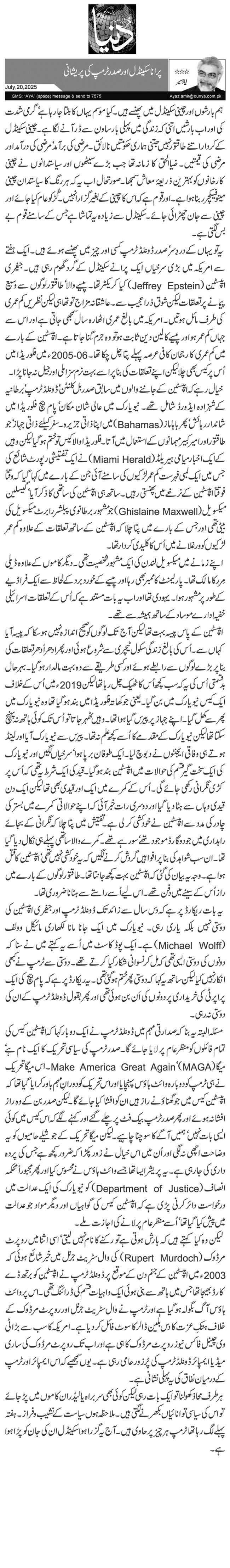 لیکن وہ کیا کہتے ہیں کہ بارش ہوتی ہے تو رکنے کا نام نہیں لیتی‘ اسی اثنا میں روپرٹ مرڈوک (Rupert Murdoch) کی وال سٹریٹ جرنل میں خبر شائع ہوئی کہ 2003ء میں ایپسٹین کے جنم دن کے موقع پر ڈونلڈ ٹرمپ نے ایپسٹین کو برتھ ڈے کارڈ بھیجا تھا جس میں ہاتھ سے بنی ہوئی ایک واہیات قسم کی ڈرائنگ تھی۔ اس پر وائٹ ہاؤس آگ بگولہ ہو گیا ہے اور ٹرمپ نے وال سٹریٹ جرنل اور روپرٹ مرڈوک کے خلاف ہتکِ عزت کا دس بلین ڈالر کا سوٹ فائل کر دیا ہے۔ امریکہ کا سب سے بڑا ٹی وی چینل فاکس نیوز روپرٹ مرڈوک کا ہی ہے اور اب تک روپرٹ مرڈوک کی ساری میڈیا ایمپائر ڈونلڈٹرمپ کی پُرزور حامی رہی ہے۔ یوں سمجھیے کہ اس ایمپائر اور ٹرمپ کے درمیان نفاق کی یہ پہلی نشانی ہے۔