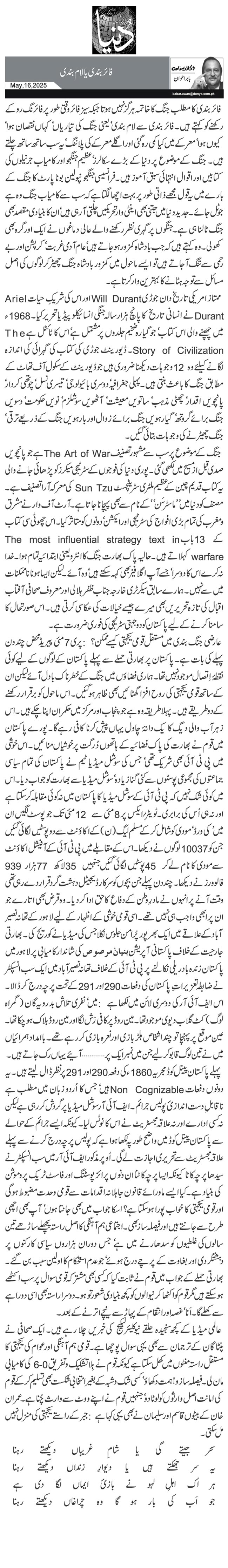 جنگ کے موضوع پر سب سے مشہور تصنیف The Art of Warہے جو پانچویں صدی قبل از مسیح میں لکھی گئی۔ پوری دنیا کی فوجوں کے سٹرٹیجی میکرز کو پڑھائی جانے والی یہ کتاب قدیم چین کے عظیم ملٹری سٹریٹیجسٹ Sun Tzu کی معرکہ آرا تصنیف ہے۔ مصنف کو دنیا میں ''ماسٹر سَن‘‘ کے نام سے بھی پہچانا جاتا ہے۔ آرٹ آف وار نے مشرق و مغرب کی تمام بڑی افواج کی سٹرٹیجی اور ایکشن‘ دونوں کو متاثر کیا۔ اس چھوٹی سی کتاب کے 13 باب The most influential strategy text in warfare کہلاتے ہیں۔ حالیہ پاک بھارت جنگ کا انٹرو یعنی ابتدائیہ تمام ہوا۔ خدا نہ کرے اس کا دوسرا‘ جسے آپ اگلا فیز بھی کہہ سکتے ہیں‘ وہ آئے۔ لیکن ایسا ہونا ناممکنات میں سے نہیں۔ ہمارے سابق سیکرٹری خارجہ جناب ظفر ہلالی اور معروف صحافی آفتاب اقبال کی تازہ تحریریں بھی میرے جیسے خیالات کی عکاسی کرتی ہیں۔ اس صورتحال کا سامنا کرنے کے لیے پاکستان کو دو جہتی سٹرٹیجی کی فوری ضرورت ہے۔