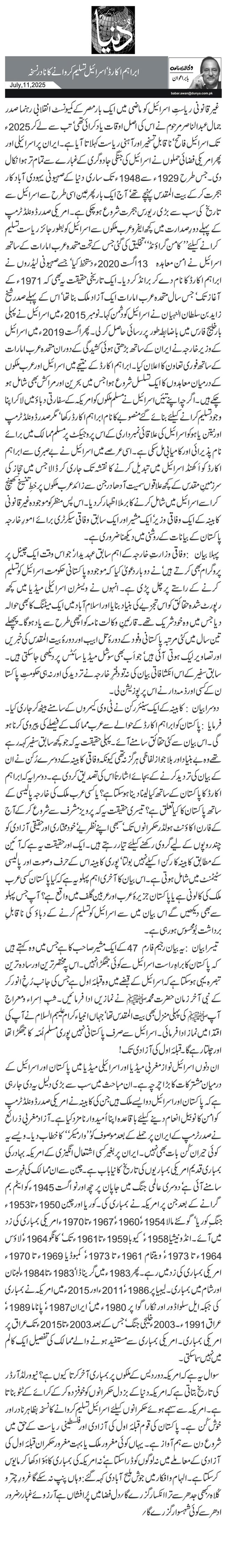 غیر قانونی ریاستِ اسرائیل کو ماضی میں ایک بار مصر کے کمیونسٹ انقلابی رہنما صدر جمال عبدالناصر مرحوم نے اس کی اصل اوقات یاد کرائی تھی‘ تب سے لے کر 2025ء تک اسرائیل فاتح‘ ناقابلِ تسخیر اور آہنی ریاست کہلاتا آیا ہے۔ ایران پر اسرائیلی اور پھر امریکی فضائی حملوں نے اسرائیل کی جنگی جادوگری کے غبارے سے تمام تر ہوا نکال دی۔ جس طرح 1929ء سے1948ء تک ساری دنیا کے صہیونی یہودی آباد کار ہجرت کرکے بیت المقدس پہنچے تھے‘ آج ایک بار پھر عین اسی طرح سے اسرائیل سے تاریخ کی سب سے بڑی ریورس ہجرت شروع ہو چکی ہے۔ امریکی صدر ڈونلڈ ٹرمپ کے پہلے دورِ صدارت میں کچھ ایفرو عرب ملکوں سے اسرائیل کو بطور جائز ریاست تسلیم کرانے کیلئے ''کامن گراؤنڈ‘‘ تخلیق کی گئی جس کے تحت متحدہ عرب امارات کے ساتھ اسرائیل نے امن معاہدہ 13 اگست 2020ء دستخط کیا‘ جسے صہیونی لیڈروں نے ابراہم اکارڈکا نام دے کر برانڈ کر دیا۔ ایک تاریخی حقیقت یہ بھی کہ 1971ء کے آغاز تک‘ جس سال متحدہ عرب امارات ایک آزاد ملک بنا تھا‘ اس کے پہلے صدر شیخ زاید بن سلطان النہیان نے اسرائیل کو دشمن کہا۔ نومبر 2015ء میں اسرائیل نے پہلی بار خلیج فارس میں باضابطہ طور پر رسائی حاصل کر لی۔ پھر اگست 2019ء میں اسرائیل کے وزیر خارجہ نے ایران کے ساتھ بڑھتی ہوئی کشیدگی کے دوران متحدہ عرب امارات کے ساتھ فوری تعاون کا اعلان کیا۔ ابراہم اکارڈ کے نتیجے میں اسرائیل اور عرب ملکوں کے درمیان معاہدوں کا ایک تسلسل شروع ہوا جس میں بحرین اور مراکش بھی شامل ہو چکے ہیں۔ اگرچہ اپنے تئیں اسرائیل نے مسلم ملکوں کو امریکہ کے سفارتی دباؤ میں لاکر اپنا وجود تسلیم کرانے کیلئے بنائے گئے منصوبے کا نام ابراہم اکارڈ رکھا‘ مگرصدر ڈونلڈ ٹرمپ اور نیتن یاہو کو اسرائیل کی علاقائی نمبرداری کے اس پروجیکٹ پر مسلم ممالک میں برائے نام پذیرائی اور کامیابی مل سکی ہے۔ اسی عرصے میں اسرائیل نے بے صبری سے ابراہم اکارڈ کو اَکھنڈ اسرائیل میں تبدیل کرنے کا نقشہ تک جاری کر ڈالا جس میں حجاز کی سرزمینِ مقدس کے کچھ علاقوں سمیت آدھا درجن سے زائد عرب ملکوں پر خطِ تنسیخ کھینچ کر اسے اسرائیل میں شامل کرنے کا برملا اظہار کر دیا۔ اس پس منظر کو موجودہ غیرقانونی کابینہ کے ایک وفاقی وزیر‘ ایک مشیر اور ایک سابق وفاقی سیکرٹری برائے امورِ خارجہ پاکستان کے بیانات کے روشنی میں دیکھنا ضروری ہے۔
