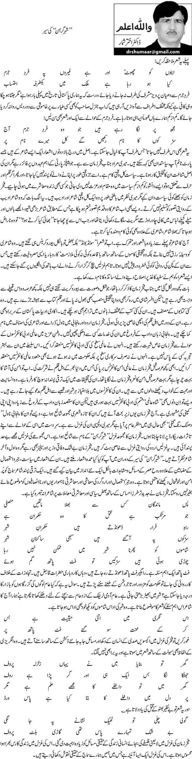 بات کچھ دور نکل گئی‘ میں جناب فخر زمان کا ذکر کر رہا تھا، جو شکل و صورت سے بیوروکریٹ لگتے ہی نہیں بلکہ کچھ عرصہ وہ اِس قبیلے سے وابستہ بھی رہے ہیں‘ لیکن افسر شاہی میں رہ کر بھی وہ اپنا تخلیقی منصب کبھی بھول نہ پائے اور قلم کتاب سے ہمیشہ جڑے رہے ہیں۔ وہ کئی کتابوں کے مصنف ہیں۔ ان کی کئی کتب کے مختلف زبانوں میں تراجم بھی ہو چکے ہیں ۔ اکادمی ادبیات پاکستان کے سربراہ بھی رہے۔ ان کے دور میں اہلِ قلم کی اچھی خاصی پزیرائی ہوئی ۔ فخر زمان اردو اور پنجابی میں ناول‘ ڈرامے اور شاعری کی اصناف میں نام کما چکے ہیں ۔ پنجابی زبان و ادب کے فروغ میں ان کی خدمات کسی سے ڈھکی چھپی نہیں ۔ وطنِ عزیز میں عالمی ادبی کانفرنسوں کے حوالے سے فخر زمان خاص شہرت رکھتے ہیں۔ انہوں نے عالمی سطح کی کئی ادبی کانفرنسیں منعقد کرائیں۔ اس سلسلے میں ان سے بہتر تجربہ کسی کے پاس نہیںہے۔ انہوں نے نہ صرف سرکاری سطح پر بلکہ حکومت میں نہ ہوتے ہوئے بھی متعدد عالمی کانفرنسیں منعقد کرائیں۔ ابھی کچھ عرصہ قبل فخر زمان نے عالمی امن کانفرنس برپا کی جس میں دنیا بھر کے اہل قلم نے شرکت کی۔ اب تو امن کی آشا کا بہت چرچا ہے مگر بہت عرصہ قبل امن کا نعرہ فخر زمان نے لگایا تھا۔ ان کی تخلیقات میں ایک ترقی پسندانہ سوچ کار فرما ہے۔ وہ انسانیت اور محبت کے خواب دیکھنے والوں میں سے ہیں ۔ان کی کانفرنسوں میں بلا امتیاز ہر شہر اور قصبے سے اہل قلم مدعو کیے جاتے رہے ہیں ۔ ویسے تو اِن دنوں بھی ''شاہ عالمی ‘‘ قسم کی ادبی کانفرنسیں بہت ہو رہی ہیںلیکن ان کا مقصد زبان و ادب کے فروغ سے زیادہ اپنی اپنی کمپنی کی مشہوری ہے ۔آج فخر زمان یوں زیرِ بحث آئے ہیں کہ ان کا تازہ شعری مجموعہ شائع ہوا ہے ، ویسے تو ان کا پنجابی ناول '' دھنک رنگ تتلی‘‘ بھی حال ہی میں منظر عام پر آیا ہے مگر میری دلچسپی ان کی غزل سے ہے۔سرِ دست میں اسی کے حوالے سے اپنے تاثرات ریکارڈ پر لانا چاہتا ہوں۔ فخر زمان کا مجموعہ غزل ''شہر گرہن‘‘ کے نام سے شائع ہوا ہے۔ اس مجموعے کی غزلیں مجھے بے حد پسند آئی ہیں ۔ یہ غزلیں اردو کی روایتی غزل سے خاصی ہٹ کر ہیں ۔فخر زمان بے شک وفاقی وزیر اور سینیٹر بھی رہے مگر وہ اول و آخر شاعر نظر آتے ہیں ۔ '' شہر گرہن‘‘ کی سیر کے دوران میں آپ کو کیا کیا عمدہ اشعار ملتے ہیں ۔ ان کے اشعار میں سیاست ،جبر و استحصال کے مضامین کے علاوہ روح عصر کے مسائل و مشاہدات بالکل ایک نئے انداز میں بیان کیے گئے ہیں۔ ایک ترقی پسند شاعر سماج کو پُر امن اور خوشحال دیکھنے کا متمنی ہوتا ہے۔ وہ جبر‘ استحصال اور اردگرد کی معاشی اور معاشرتی ناہمواریوں اور ناانصافیوں کو موضوع بنائے بغیر نہیں رہ سکتا۔ فخر زمان نے جدید تر طرزِاحساس کے ساتھ بعض سیاسی اور معاشرتی معاملات پر شاعرانہ تبصرہ کیا ہے۔
