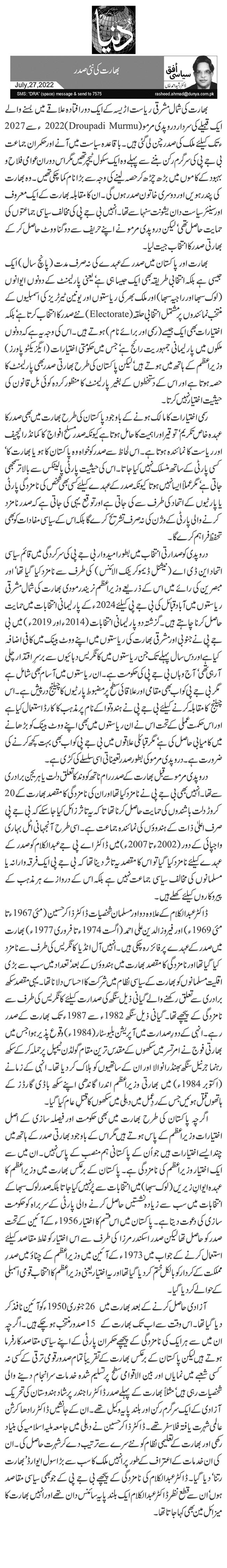 رسمی اختیارات کا مالک ہونے کے باوجود پاکستان کی طرح بھارت میں بھی صدر کا عہدہ خاص تکریم‘ توقیر اور اہمیت کا حامل ہوتا ہے کیونکہ صدر مسلح افواج کا کمانڈر انچیف اور ریاست کا نمائندہ ہوتا ہے۔ اس لحاظ سے صدر کوخواہ وہ پاکستان کا ہو یا بھارت کا‘ کسی پارٹی کے ساتھ منسلک نہیں کیا جاتا۔ اس کی حیثیت پارٹی پالیٹکس سے بالاتر سمجھی جاتی ہے‘ مگر عملاً ایسا نہیں ہوتا کیونکہ صدر کے عہدے کیلئے کسی بھی شخص کی نامزدگی پارٹی یا پارٹیوں کے اتحاد کی طرف سے کی جاتی ہے اور توقع یہی کی جاتی ہے کہ صدر نامزد کرنے والی پارٹی کے وژن کی نہ صرف تشریح کرے گا بلکہ اس کے سیاسی مفادات کو بھی تحفظ فراہم کرے گا۔