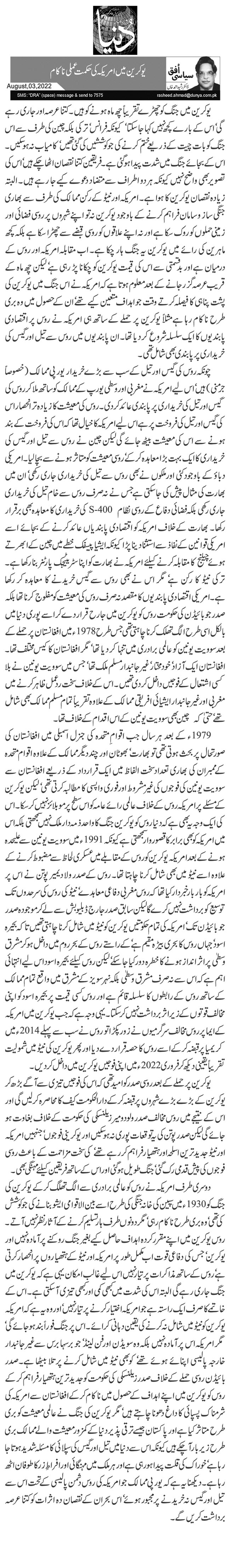 یوکرین میں جنگ کو چھڑے تقریباً چھ ماہ ہونے کو ہیں۔ کتنا عرصہ اور جاری رہے گی‘ اس کے بارے کچھ نہیں کہا جا سکتا‘ کیونکہ فرانس‘ ترکی بلکہ چین کی طرف سے اس جنگ کو بات چیت کے ذریعے ختم کرنے کی جو کوششیں کی گئی تھیں‘ کامیاب نہ ہو سکیں۔ اس کے بجائے جنگ میں شدت پیدا ہو گئی ہے۔ فریقین کتنا نقصان اٹھا چکے ہیں‘ اس کی تصویر بھی واضح نہیں کیونکہ ہر دو اطراف سے متضاد دعوے کیے جا رہے ہیں۔ البتہ زیادہ نقصان یوکرین کا ہوا ہے۔ امریکہ اور نیٹو کے رکن ممالک کی طرف سے بھاری جنگی ساز و سامان فراہم کرنے کے باوجود یوکرین نہ تو اپنے شہروں پر روسی فضائی اور زمینی حملوں کو روک سکا ہے اور نہ اپنے علاقوں کو روسی قبضے سے چھڑا سکا ہے بلکہ کچھ ماہرین کی رائے میں یوکرین یہ جنگ ہار چکا ہے۔ اب مقابلہ امریکہ اور روس کے درمیان ہے اور بدقسمتی سے اس کی قیمت یوکرین کو چکانا پڑ رہی ہے‘ لیکن چھ ماہ کے قریب عرصہ گزر جانے کے بعد معلوم ہوتا ہے کہ امریکہ نے اس جنگ میں یوکرین کی پشت پناہی کا فیصلہ کرتے وقت جو اہداف متعین کیے تھے‘ ان کے حصول میں وہ بری طرح ناکام رہا ہے مثلاً یوکرین پر حملے کے ساتھ ہی امریکہ نے روس پر اقتصادی پابندیوں کا ایک سلسلہ شروع کر دیا تھا۔ ان پابندیوں میں روس سے تیل اور گیس کی خریداری پر پابندی بھی شامل تھی۔