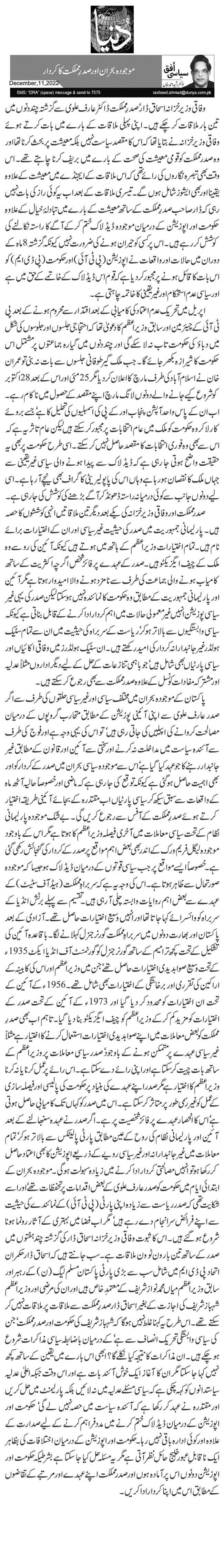 صدر مملکت اور وفاقی وزیر خزانہ کی یکے بعد دیگر تین ملاقاتیں انہی کوششوں کا حصہ ہیں۔ پارلیمانی جمہوریت میں صدر کی حیثیت غیرسیاسی اور ان کے اختیارات برائے نام ہیں۔ تمام اختیارات وزیراعظم کے ہاتھ میں ہوتے ہیں کیونکہ آئین کی رو سے وہ ملک کے چیف ایگزیکٹو ہیں۔ صدر کے عہدے پر فائز شخص اگرچہ اکثریت کے ساتھ کامیاب ہونے والی جماعت کی طرف سے نامزد ہونے والا امیدوار ہوتا ہے مگر آئین اور پارلیمانی جمہوریت کے مطابق وہ حکومت کا نمائندہ نہیں ہو سکتا لیکن صدر کی یہی غیر سیاسی پوزیشن انہیں غیر معمولی حالات میں اہم کردار ادا کرنے کے قابل بناتی ہے کیونکہ سیاسی وابستگیوں سے بالا تر ہو کر‘ ریاست کے سربراہ کی حیثیت میں ان سے تمام سٹیک ہولڈر غیر جانبدارانہ کردار کی امید رکھتے ہیں۔ ان سٹیک ہولڈرز میں وفاقی اکائیاں اور سیاسی پارٹیاں بھی شامل ہیں‘ جو باہمی تنازعات کے حل کے لیے دیگر اداروں مثلاً عدلیہ اور مشترکہ مفادات کونسل کے علاوہ صدر مملکت سے بھی رجوع کر سکتے ہیں۔