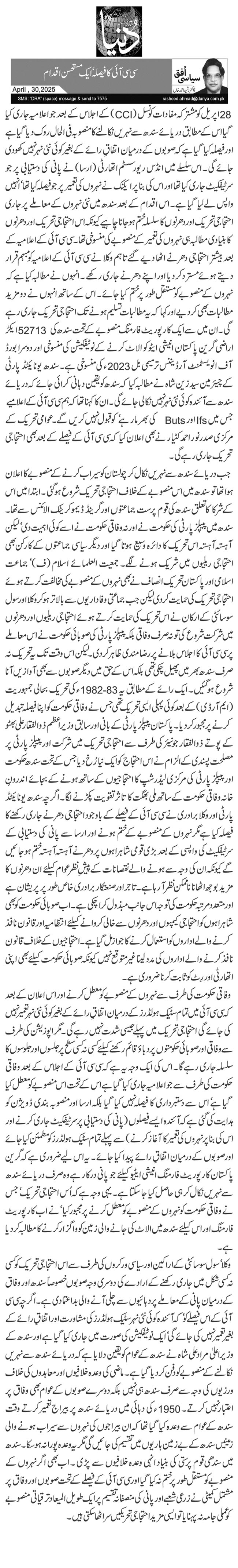 جب دریائے سندھ سے نہریں نکال کر چولستان کو سیراب کرنے کے منصوبے کا اعلان ہوا تھا تو سندھ میں اس منصوبے کے خلاف احتجاجی تحریک شروع ہو گئی ۔ ابتدا میں اس کے شرکا کا تعلق سندھ کی قوم پرست جماعتوں اور گرینڈ ڈیمو کریٹک الائنس سے تھا۔ سندھ میں پیپلز پارٹی کی حکومت نے اور نہ وفاقی حکومت نے اسے کوئی اہمیت دی‘ لیکن آہستہ آہستہ اس تحریک کا دائرہ وسیع ہوتا گیا اور دیگر سیاسی جماعتوں کے کارکن بھی احتجاجی ریلیوں میں شریک ہونے لگے۔ جمعیت العلمائے اسلام (ف)‘ جماعت اسلامی اور پاکستان تحریک انصاف نے بھی نہروں کے منصوبے کی مخالفت کرتے ہوئے احتجاجی تحریک کی حمایت کردی لیکن جب جماعتی وفاداریوں سے بالاتر ہو کر وکلا اور سول سوسائٹی کے ارکان نے اس تحریک کی حمایت کرتے ہوئے احتجاجی ریلیوں اور دھرنوں میں شرکت شروع کی تو نہ صرف وفاقی بلکہ پیپلز پارٹی کی صوبائی حکومت نے اس معاملے پر سی سی آئی کا اجلاس بلانے پر رضامندی ظاہر کر دی۔ لیکن اس وقت تک یہ تحریک نہ صرف سندھ بھر میں پھیل چکی تھی بلکہ اس کے حق میں دیگر صوبوں سے بھی آوازیں آنا شروع ہو گئیں۔ ایک رائے کے مطابق یہ 1982-83ء کی تحریک بحالی جمہوریت (ایم آر ڈی) کے بعد کوئی پہلی ایسی تحریک تھی جس نے وفاقی حکومت کو اپنا فیصلہ تبدیل کرنے پر مجبور کر دیا۔ پاکستان پیپلز پارٹی کے بانی اور سابق وزیراعظم ذوالفقار علی بھٹو کے پوتے ذوالفقار جونیئر کی طرف سے احتجاجی تحریک میں شرکت اور پیپلز پارٹی پر مصلحت پسندی کے الزام نے اس احتجاج کو ایک نیا رُخ دیا جس کے تحت سندھ حکومت اور پیپلز پارٹی کی مرکزی لیڈر شپ کا احتجاجیوں کے ساتھ ہونے کے بجائے اندرونِ خانہ وفاقی حکومت کے ساتھ ملی بھگت کا تاثر تقویت پکڑنے لگا۔ اگرچہ سندھ یونائیٹڈ پارٹی اور وکلا برادری نے سی سی آئی کے فیصلے کے باوجود احتجاجی دھرنے جاری رکھنے کا فیصلہ کیا ہے مگر نہروں کے منصوبے کے ختم ہونے اور ارسا سے پانی کی دستیابی کے سرٹیفکیٹ کی واپسی کے بعد بڑی قومی شاہراہوں پر دھرنے آہستہ آہستہ ختم ہو جائیں گے کیونکہ ان کی وجہ سے ہونے والے نقصانات کے پیشِ نظر عوام کیلئے ان دھرنوں کا مزید بوجھ اٹھانا ناممکن نظر آ رہا ہے۔ تاجر اور صنعتکار برادری خاص طور پر پریشان ہے اور متعدد مرتبہ حکومت کی توجہ اس جانب مبذول کرا چکی ہے۔ اب صوبائی حکومت کو بھی شاہراہوں کو احتجاجی کیمپوں اور دھرنوں سے خالی کروانے کیلئے انتظامیہ اور قانون نافذ کرنے والے اداروں کو استعمال کرنے کا جواز مل گیا ہے۔ احتجاجیوں کے خلاف قانون نافذ کرنے والے اداروں کی مدد لینا غیرمتوقع نہیں کیونکہ صوبائی حکومت کیلئے بھی اپنی اتھارٹی اور رِٹ کو ثابت کرنا ضروری ہے۔