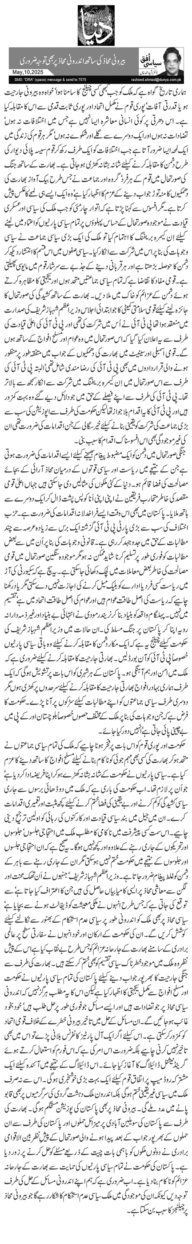 جنگی صورتحال میں دشمن کو ایک مضبوط پیغام بھیجنے کیلئے ایسے اقدامات کی ضرورت ہوتی ہے جن کے نتیجے میں ریاست اور سیاسی قوتوں کے درمیان محاذ آرائی کے بجائے مصالحت کی فضا قائم ہو۔ دنیا کے کئی ملکوں کی مثالیں دی جا سکتی ہیں جہاں اعلیٰ قومی مقصد کی خاطر متحارب فریقین نے اپنی اپنی اَنا کو پس پشت ڈال کر ایک دوسرے سے ہاتھ ملایا۔ پاکستان میں بھی اس وقت ایسے فراخدلانہ اقدامات کی ضرورت ہے۔ حزبِ اختلاف کی سب سے بڑی پارٹی پی ٹی آئی گزشتہ ایک برس سے زیادہ عرصہ سے چند مطالبات کے حق میں جدوجہد کر رہی ہے۔ قانونی وجوہات کی بنا پر اُن میں سے بعض مطالبات کو فوری طور پر تسلیم کرنا شاید ممکن نہ ہو مگر موجودہ سنگین صورتحال میں قومی مصالحت کی خاطر بعض معاملات میں لچک دکھائی جا سکتی ہے۔ یہ سچ ہے کہ سکیورٹی کی آڑ میں ریاست کسی فرد یا ادارے کو بلیک میل کرنے کی اجازت نہیں دے سکتی مگر یاد رکھنا چاہیے کہ ریاست کی اصل طاقت عوام ہیں اور عوام کی اصل طاقت اتحاد میں ہے‘ تقسیم میں نہیں۔ پہلگام واقعہ کو بنیاد بنا کر نریندر مودی نے انتہائی بے بنیاد اور غیر ذمہ دارانہ رویہ اپنا کر پاکستان پر جنگ مسلط کی۔ان حالات میں وزیراعظم شہباز شریف کی حکومت کیلئے چیلنج یہ ہے کہ ایک مکار دشمن کا مقابلہ کرنے کیلئے وہ باقی سیاسی پارٹیوں خصوصاً پی ٹی آئی کو آن بورڈ لیں ۔ بھارتی جارحیت کا مقابلہ کرنے کیلئے ضروری ہے کہ ملک میں امن اور ہم آہنگی ہو۔ پاکستان کے ہر شہری کو اس بات پر تشویش ہوگی کہ ایک طرف ہماری بہادر افواج بھارتی جارحیت کا مقابلہ کرنے کیلئے سرحدوں پر کھڑی ہوں مگر دوسری طرف سیاسی جماعتوں کو اپنے مطالبات کیلئے سڑکوں پر آنا پڑے۔ حکومت کا فرض ہے کہ جن وجوہات کی بنا پر ملک کے مختلف حصوں خصوصاً بلوچستان اور کے پی میں بے چینی پائی جاتی ہے‘ انہیں دور کیا جائے۔