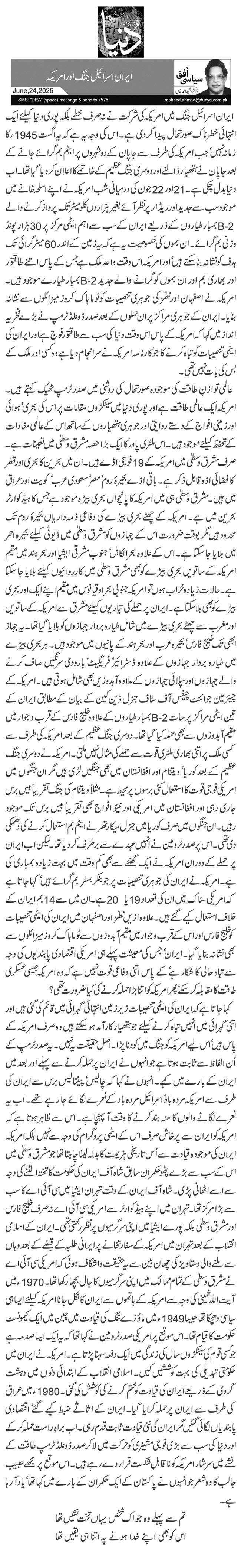 ایران اسرائیل جنگ میں امریکہ کی شرکت نے نہ صرف خطے بلکہ پوری دنیا کیلئے ایک انتہائی خطرناک صورتحال پیدا کر دی ہے۔ اس کی وجہ یہ ہے کہ یہ اگست 1945ء کا زمانہ نہیں‘ جب امریکہ کی طرف سے جاپان کے دو شہروں پر ایٹم بم گرائے جانے کے بعد جاپان نے ہتھیار ڈالنے اور دوسری جنگ عظیم کے خاتمے کا اعلان کر دیا گیا تھا۔ اب دنیا بدل چکی ہے۔ 21اور 22جون کی درمیانی شب امریکہ نے اپنے اسلحہ خانے میں موجود سب سے جدید اور ریڈار پر نظر آئے بغیر ہزاروں کلو میٹر تک پرواز کرنے والے B-2 بمبار طیاروں کے ذریعے ایران کے سب سے اہم ایٹمی مرکز پر 30ہزار پونڈ وزنی بم گرائے۔ ان بموں کی خصوصیت یہ ہے کہ یہ زمین کے اندر 60میٹر گرائی تک ہدف کو نشانہ بنا سکتے ہیں‘ اور امریکہ اس وقت واحد ملک ہے جس کے پاس اتنے طاقتور اور بھاری بم اور ان بموں کو گرانے والے جدید B-2بمبار طیارے موجود ہیں۔ امریکہ نے اصفہان اور نطنزکی جوہری تنصیبات کو ٹوما ہاک کروز میزائلوں سے نشانہ بنایا۔ ایران کے جوہری مراکز پر ان حملوں کے بعد صدر ڈونلڈ ٹرمپ نے بڑے فخریہ انداز میں کہا کہ امریکہ کے پاس اس وقت دنیا کی سب سے طاقتور فوج ہے اور ایران کی ایٹمی تنصیبات کو تباہ کرنے کا جو کارنامہ امریکہ نے سرانجام دیا ہے وہ کسی اور ملک کے بس کی بات نہیں تھی۔