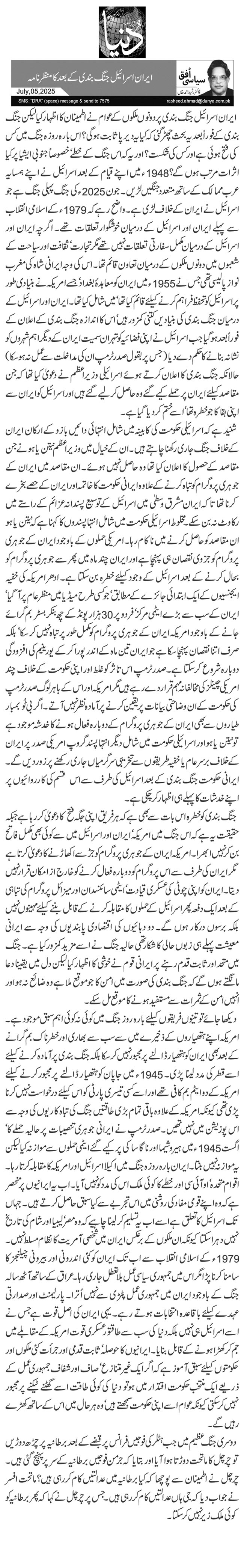 ایران اسرائیل جنگ بندی پر دونوں ملکوں کے عوام نے اطمینان کا اظہار کیا لیکن جنگ بندی کے فوراً بعد یہ بحث چھڑ گئی کہ کیا یہ دیرپا ثابت ہو گی؟ اس بارہ روزہ جنگ میں کس کی فتح ہوئی ہے اور کس کی شکست؟ اور یہ کہ اس جنگ کے خطے‘ خصوصاً جنوبی ایشیا پر کیا اثرات مرتب ہوں گے؟1948ء میں اپنے قیام کے بعد اسرائیل نے اپنے ہمسایہ عرب ممالک کے ساتھ متعدد جنگیں لڑیں۔ جون 2025ء کی جنگ پہلی جنگ ہے جو اسرائیل نے ایران کے خلاف لڑی ہے۔ واضح رہے کہ 1979ء کے اسلامی انقلاب سے پہلے ایران اور اسرائیل کے درمیان خوشگوار تعلقات تھے۔ اگرچہ ایران اور اسرائیل کے درمیان مکمل سفارتی تعلقات نہیں تھے مگر تجارت‘ ثقافت اور سیاحت کے شعبوں میں دونوں ملکوں کے درمیان تعاون قائم تھا۔ اس کی وجہ ایرانی شاہ کی مغرب نواز پالیسی تھی جس نے 1955ء میں ایران کو معاہدۂ بغداد‘ جسے امریکہ نے بنیادی طور پر اسرائیل کو تحفظ فراہم کرنے کیلئے قائم کیا تھا‘ میں شامل کیا تھا۔ ایران اور اسرائیل کے درمیان جنگ بندی کی بنیادیں کتنی کمزور ہیں‘ اس کا اندازہ جنگ بندی کے اعلان کے فوراً بعد ہو گیا جب اسرائیل نے اپنی فضائیہ کو تہران سمیت ایران کے دیگر اہم شہروں کو نشانہ بنانے کا حکم دے دیا (جس پر بقول صدر ٹرمپ ان کی مداخلت سے عمل نہ ہو سکا) حالانکہ جنگ بندی کا اعلان کرتے ہوئے اسرائیلی وزیراعظم نے دعویٰ کیا تھا کہ جن مقاصد کیلئے ایران پر حملے کیے گئے وہ حاصل کر لیے گئے ہیں اور اسرائیل کو ایران سے اپنی بقا کا جو خطرہ تھا‘ اسے ختم کر دیا گیا ہے۔