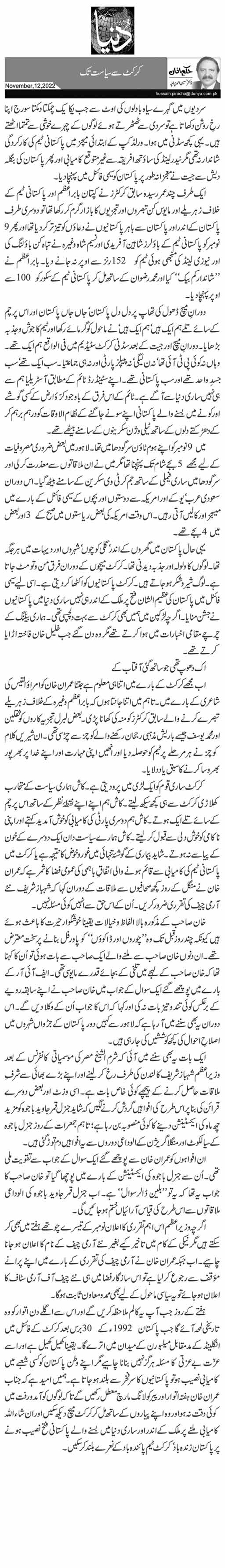 ہفتے کے روز جب آپ یہ کالم ملاحظہ کریں گے اور اس سے اگلے دن اتوار کو وہ تاریخی لمحہ آئے گا جب پاکستان 1992 ء کے 30 برس بعد کرکٹ کے فائنل میں انگلینڈ کے مدمقابل میلبورن کے میدان میں اترے گا۔ یقینا کھیل کھیل ہے اور اسے عزّت بے عزتی کا مسئلہ ہرگز نہیں بنانا چاہیے مگر اپنے وطن پاکستان کو کسی شعبے میں کامیابی نصیب ہو تو پاکستانیوں کا سر فخر سے بلند ہو جاتا ہے۔ ہمیں امید ہے کہ جناب عمران خان ہفتہ اتوار اور پیر کو لانگ مارچ معطل رکھیں گے تاکہ لوگوں کو آمد و رفت میں کوئی دقت نہ ہو اور وہ اپنے پیاروں کے ساتھ مل کر کرکٹ میچ دیکھ سکیں اور ان شاء اللہ کامیابی ملنے پر ملک کے اندر اور ساری دنیا میں بسنے والے پاکستانی فتح نصیب ہونے پر پاکستان زندہ باد‘ کرکٹ ٹیم پائندہ باد کے نعرے بلند کر سکیں۔