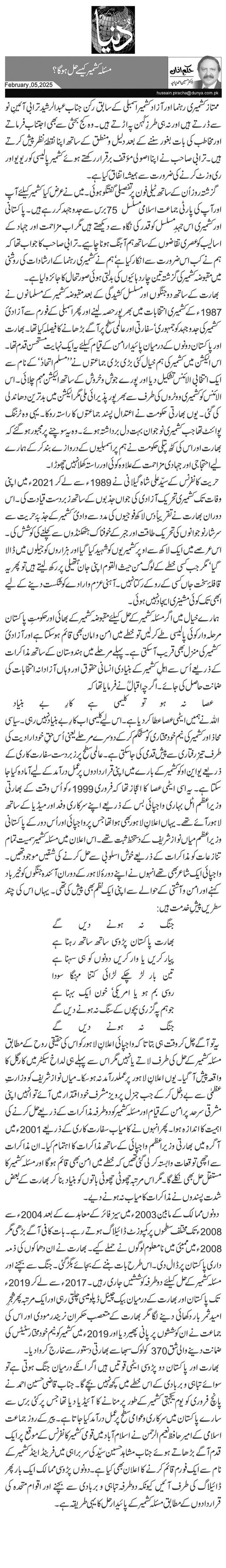 بھارت اور پاکستان دو پڑوسی ایٹمی قوتیں ہیں اگر انکے درمیان جنگ ہوتی ہے تو سوائے تباہی و بربادی کے اس خطے میں کچھ نہیں بچے گا۔ جناب قاضی حسین احمد نے پانچ فروری کو یوم یکجہتی کشمیر کے طور پر منانے کا آئیڈیا دیا تھا جس پر کئی برس سے سارے پاکستان میں سرکاری و عوامی سطح پر عمل درآمد کیا جاتا ہے۔ پیر کے روز جماعت اسلامی کے امیر حافظ نعیم الرحمن نے اسلام آباد میں قومی کشمیر کانفرنس کے موقع پر ایک قدم آگے بڑھاتے ہوئے جناب مشاہد حسین سیّد کی سربراہی میں فرینڈ اینڈ کشمیر کے نام سے ایک فورم قائم کرنے کا اعلان بھی کیا ہے۔دونوں پڑوسی ممالک ایک بار پھر ڈائیلاگ کی طرف آئیں کیونکہ دوطرفہ تباہی و بربادی سے بچنے اور اقوام متحدہ کی قراردادوں کے مطابق مسئلہ کشمیر کے پائیدار حل کا یہی طریقہ ہے۔
