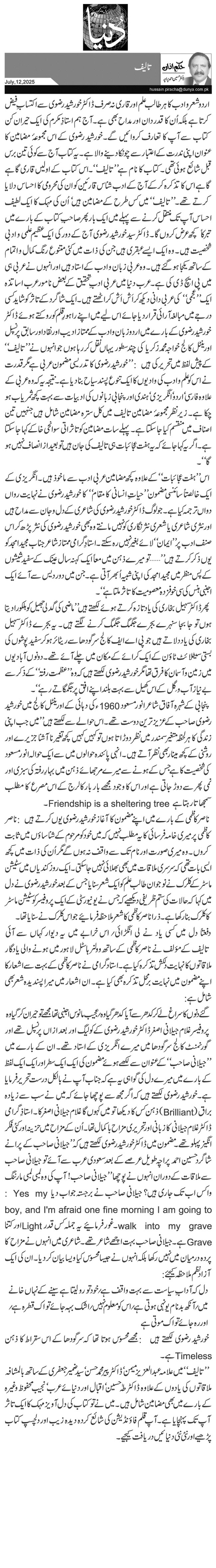پروفیسر غلام جیلانی اصغر ڈاکٹر خورشید رضوی کے کولیگ اور بعد ازاں پرنسپل تھے اور گورنمنٹ کالج سرگودھا میں میرے انگریزی کے استاد تھے۔ ان کے بارے میں ''جیلانی صاحب‘‘ کے عنوان سے لکھے ہوئے مضمون کی ایک ایک سطر اور ایک ایک لفظ کے بارے میں میرے دل کی گواہی یہ ہے کہ جناب آپ نے بالکل درست تحریر فرمایا ہے۔ خورشید رضوی لکھتے ہیں کہ اگر مجھ سے پوچھا جائے کہ میں نے سب سے زیادہ براق (Brilliant) ذہن کس کا دیکھا تو میں کہوں گا غلام جیلانی اصغر کا۔ استاذِ گرامی ڈاکٹر غلام جیلانی کا زبانی اور تحریری مزاح باکمال تھا۔ اُن کے مزاح میں حزینہ اور کئی فکر انگیز پہلو تھے۔ مضمون میں ڈاکٹر خورشید رضوی لکھتے ہیں کہ ''جیلانی صاحب کے پرانے شاگرد حسین احمد پراچہ طویل عرصے کے بعد سعودی عرب سے آئے تو جیلانی صاحب سے ملاقات کے دوران انہوں نے پوچھا ''جیلانی صاحب! آپ کی وہ لمبی لمبی مارننگ واکس اب تک جاری ہیں؟ جیلانی صاحب نے برجستہ جواب دیا: Yes my boy, and I'm afraid one fine morning I am going to walk into my grave۔ غور فرمائیے یہ جملہ کس قدر Lightاور کتنا Graveہے۔ جیلانی صاحب بہت اچھے شاعر تھے۔ شاعری میں انہوں نے مزاح کا پردہ درمیان میں نہیں رکھا بلکہ انہوں نے جیسا محسوس کیا ویسا بیان کر دیا۔ ان کی ایک آزاد نظم ملاحظہ کیجئے: