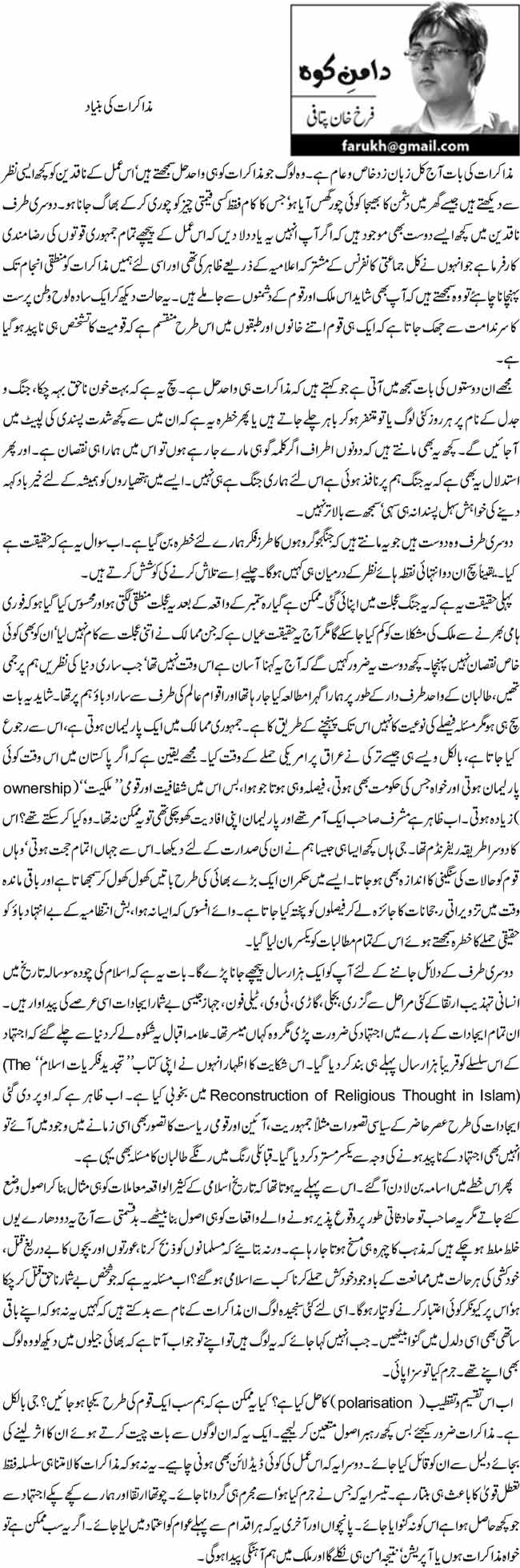 مذاکرات کی بات آج کل زبان زد خاص و عام ہے۔ وہ لوگ جو مذاکرات کو ہی واحد حل سمجھتے ہیں‘ اس عمل کے ناقدین کو کچھ ایسی نظر سے دیکھتے ہیں جیسے گھر میں دشمن کا بھیجا کوئی چور گھس آیا ہو‘ جس کا کام فقط کسی قیمتی چیز کو چوری کرکے بھاگ جانا ہو۔ دوسری طرف ناقدین میں کچھ ایسے دوست بھی موجود ہیں کہ اگر آپ انہیں یہ یاد دلا دیں کہ اس عمل کے پیچھے تمام جمہوری قوتوں کی رضامندی کارفرما ہے جو انہوں نے کل جماعتی کانفرنس کے مشترکہ اعلامیہ کے ذریعے ظاہر کی تھی اور اسی لئے ہمیں مذاکرات کو منطقی انجام تک پہنچانا چاہئے تو وہ سمجھتے ہیں کہ آپ بھی شاید اس ملک اور قوم کے دشمنوں سے جا ملے ہیں۔ یہ حالت دیکھ کر ایک سادہ لوح وطن پرست کا سر ندامت سے جھک جاتا ہے کہ ایک ہی قوم اتنے خانوں اور طبقوں میں اس طرح منقسم ہے کہ قومیت کا تشخص ہی ناپید ہو گیا ہے۔