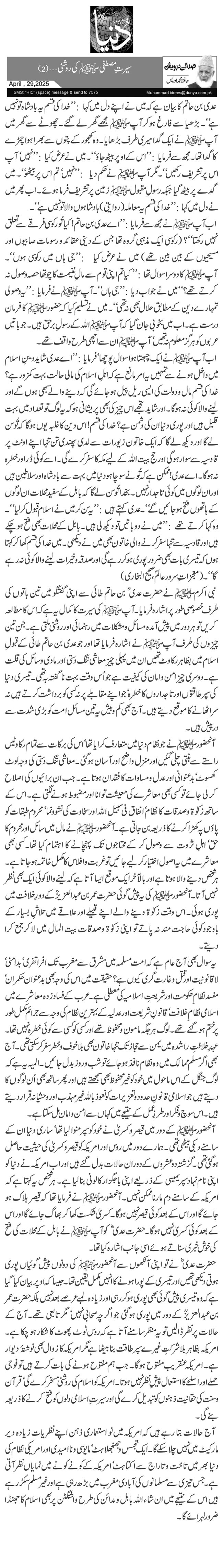 نبی اکرمﷺ نے حضرت عدیؓ بن حاتم طائی سے اپنی گفتگو میں تین باتوں کی طرف خصوصی طور پر اشارہ فرمایا۔ آپﷺ کی سیرت کا کمال یہ ہے کہ اس کا مطالعہ کریں تو ہر دور میں پیش آمدہ مسائل و مشکلات میں رہنمائی اور روشنی ملتی ہے۔ جن تین چیزوں کی طرف آپﷺ نے اشارہ فرمایا تھا اور جو عدی بن حاتم طائی کے قبولِ اسلام میں بظاہر رکاوٹ تھیں ان میں پہلی چیز معاشی تنگ دستی اور مادی وسائل کی قلت ہے۔ دوسری چیز امن و امان کی کیفیت ہے جو اُس وقت بہت ناگفتہ بہ تھی۔ تیسری دنیا کی سپر طاقتوں اور تاجداروں کا خطرہ‘ جو اپنے مقابلے پر نہ کسی کو برداشت کرتے ہیں نہ سر اٹھانے کا موقع دیتے ہیں۔ آج بھی کم و بیش یہ تین مسائل امت کو بڑی شدت سے درپیش ہیں۔
