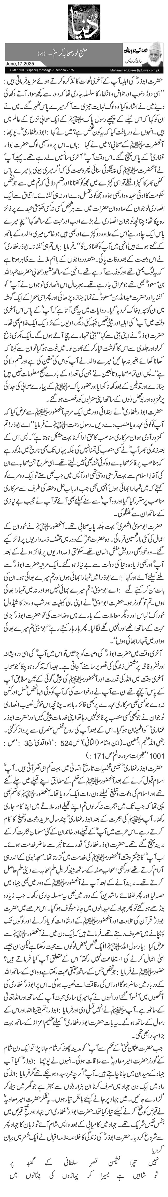 حضرت ابوذر غفاریؓ جیسی شخصیات تاریخِ انسانی میں بہت کم ہی نظر آتی ہیں۔ آپؓ اسلام قبول کرنے کے بعد آنحضورﷺ کے حکم کے مطابق اپنے قبیلے میں چلے گئے تھے اور اسلام کی دعوت و تبلیغ کیلئے دن رات ایک کر دیا تھا۔ آنحضورﷺ کا حکم بھی یہی تھا کہ جب تک میں ہجرت نہ کر لوں تم اپنے قبیلے اور علاقے میں اپنا کام جاری رکھنا۔ آپﷺ کی ہجرت کے بعد ابوذر غفاریؓ چند سال مزید دعوت و تبلیغ کا کام کرتے رہے۔ اس عرصے میں آپؓ کے قبیلے اور خاندان کے کئی مسلمان ہجرت کر کے مدینہ پہنچ گئے تھے۔ حضرت ابوذر غفاریؓ قدرے تاخیر سے حاضر خدمت ہوئے۔ اب آپؓ کا بیشتر وقت آنحضورﷺ کی خدمت میں گزرتا تھا۔ مسجد نبوی کے اندر ہی آرام کرتے تھے اور کبھی اصحابِ صفہ کے ساتھ بیٹھ کر اہلِ علم صحابہ سے دینی علم حاصل کرتے تھے۔ مدینہ آنے کے بعد آپ نے آنحضورﷺ کے دور میں بھی جہاد میں حصہ لیا اور پھر خلفائے راشدینؓ کے دور میں بھی یہ سلسلہ جاری رکھا۔ جب زیادہ بوڑھے ہو گئے تو پھر جہاد کے میدانوں میں جانا موقوف ہو گیا۔ اس عرصے میں حضرت ابوذرؓ قرآن کی تلاوت اور آنحضورﷺ کے ارشادات کو یاد کرنے اور لوگوں تک پہنچانے میں مصروف رہتے تھے۔ فرماتے ہیں کہ ایک دن میں نے آنحضورﷺ سے عرض کیا: یا رسول اللہﷺ! ایک شخص بعض لوگوں سے محبت رکھتا ہے لیکن ان جیسے اعلیٰ اعمال کرنے کی استطاعت نہیں رکھتا‘ اس کے متعلق آپ کیا فرماتے ہیں؟ حضورﷺ نے فرمایا: جو شخص جس کے ساتھ حقیقی محبت رکھتا ہے وہ اسی کے ساتھ اللہ کے دربار میں حاضر ہو گا اور اس کی رفاقت اسے نصیب ہو گی۔ اس پر ابوذرؓ غفاری کی آنکھوں میں آنسو آ گئے اور انہوں نے کہا میری ساری محبت آپ کے ساتھ اور اللہ تعالیٰ کے ساتھ ہے۔ آپﷺ نے انہیں تسلی دی اور فرمایا: ابوذر! تم یقینا اللہ اور اس کے رسول کے ساتھ ہو گے۔ یہ بات حضرت ابوذر غفاریؓ کیلئے عظیم اعزاز کے ساتھ بہت بڑا سہارا بھی تھی۔