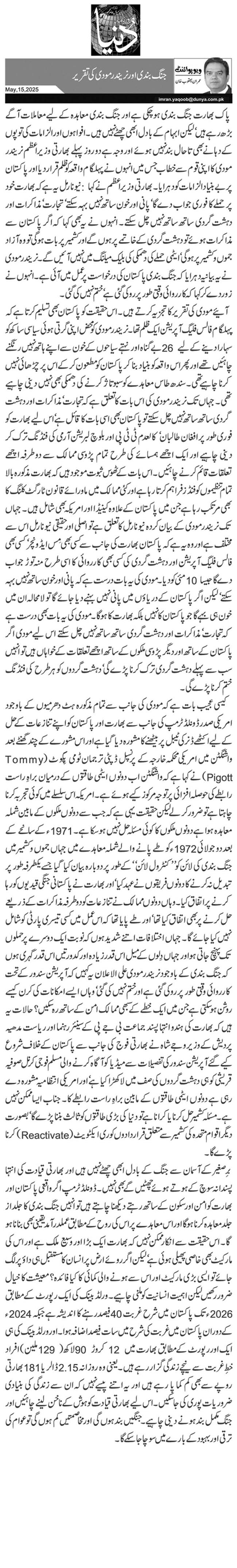 آئیے مودی کی تقریر کا تجزیہ کرتے ہیں۔ اس حقیقت کو پاکستان بھی تسلیم کرتا ہے کہ پہلگام فالس فلیگ آپریشن ایک ظلم تھا۔ نریندر مودی کو محض اپنی گرتی ہوئی سیاسی ساکھ کو سہارا دینے کے لیے 26 بے گناہ اور نہتے سیاحوں کے خون سے اپنے ہاتھ نہیں رنگنے چاہئیں تھے اور پھر اس واقعہ کو بنیاد بنا کر پاکستان کو مطعون کر کے اس پر چڑھائی نہیں کرنا چاہیے تھی۔ سندھ طاس معاہدے کو سبوتاژ کرنے کی دھمکی بھی نہیں دینی چاہیے تھی۔ جہاں تک نریندر مودی کی اس بات کا تعلق ہے کہ تجارت‘ مذاکرات اور دہشت گردی ساتھ ساتھ نہیں چل سکتے تو پاکستان بھی اسی بات کا قائل ہے‘ اس لیے بھارت کو فوری طور پر افغان طالبان‘ کالعدم ٹی ٹی پی اور بلوچ لبریشن آرمی کی فنڈنگ ترک کر دینی چاہیے اور ایک اچھے ہمسائے کی طرح تمام پڑوسی ممالک سے دو طرفہ اچھے تعلقات قائم کرنے چاہئیں۔ اس بات کے ٹھوس ثبوت موجود ہیں کہ بھارت مذکورہ بالا تمام تنظیموں کو فنڈز فراہم کرتا رہا ہے اور کئی ممالک میں ماورائے قانون ٹارگٹ کلنگ کا بھی مرتکب رہا ہے جن میں پاکستان کے علاوہ کینیڈا اور امریکہ بھی شامل ہیں۔ جہاں تک نریندر مودی کے بیان کردہ نیو نارمل کا تعلق ہے تو اصلی اور حقیقی نیو نارمل اس سے مختلف ہے اور وہ یہ ہے کہ پاکستان بھارت کی جانب سے کسی بھی مِس ایڈونچر‘ کسی بھی فالس فلیگ آپریشن اور دہشت گردی کی کسی بھی کارروائی کا اسی طرح منہ توڑ جواب دے گا جیسا 10 مئی کو دیا۔ مودی کی یہ بات درست ہے کہ پانی اور خون ساتھ نہیں بہہ سکتے‘ لیکن اگر پاکستان کے دریاؤں میں پانی نہیں بہنے دیا جائے گا تو لا محالہ ان میں خون ہی بہے گا جو پاکستان کا نہیں بلکہ بھارت کا ہو گا۔ مودی کی یہ بات بھی درست ہے کہ تجارت‘ مذاکرات اور دہشت گردی ساتھ ساتھ نہیں چل سکتے اس لیے مودی اگر پاکستان کے ساتھ اور دیگر پڑوسی ملکوں کے ساتھ اچھے تعلقات کے خواہاں ہیں تو انہیں سب سے پہلے دہشت گردی ترک کرنا پڑے گی‘ دہشت گردوں کو ہر طرح کی فنڈنگ ختم کرنا پڑے گی۔