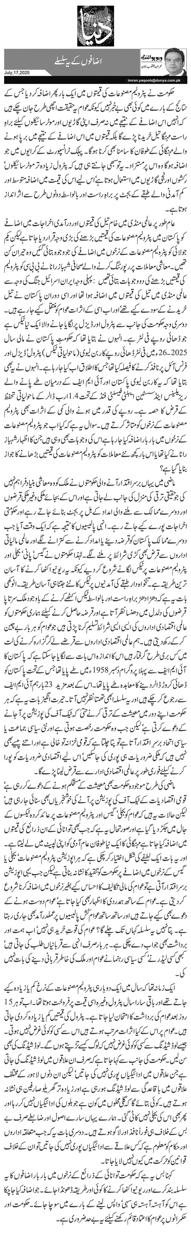 عام طور پر عالمی منڈی میں خام تیل کی قیمتوں اور درآمدی اخراجات میں اضافے کو پاکستان میں پٹرولیم مصنوعات کی قیمتیں بڑھنے کی بڑی وجہ قرار دیا جاتا ہے لیکن یکم جولائی کو پٹرولیم مصنوعات کے نرخوں میں اضافے کی جو وجوہ بتائی گئیں وہ حیران کن تھیں۔ معاشی معاملات پر رپورٹنگ کرنے والے صحافی شہباز رانا نے بی بی سی کو پٹرولیم کی قیمتیں بڑھنے کی دو وجوہات بتائی تھیں: پہلی وجہ ایران اسرائیل جنگ کی وجہ سے عالمی منڈی میں تیل کی قیمتوں میں اضافہ ہوا تھا اور اسی دوران پاکستان نے تیل خریدنے کے سودے کیے تھے‘ اور اب اسی کے اثرات عوام کو منتقل کیے جا رہے ہیں۔ دوسری وجہ حکومت کی جانب سے پٹرول اور ڈیزل پر لگایا جانے والا ایک نیا ٹیکس ہے جو ڈھائی روپے فی لٹر ہے۔ انہوں نے بتایا تھا کہ حکومتِ پاکستان نے مالی سال 2025-26ء میں فی لٹر ڈھائی روپے کاربن لیوی (ماحولیاتی ٹیکس) پٹرول‘ ڈیزل اور فرنس آئل پر نافذ کرنے کا فیصلہ کیا تھا جس کا اطلاق اب کیا جا رہا ہے۔ انہوں نے یہ بھی بتایا تھا کہ یہ کاربن لیوی پاکستان اور آئی ایم ایف کے درمیان طے پانے والے ریزیلینس اینڈ سسٹین ایبلٹی فیسلٹی فنڈ کے تحت 1.4ارب ڈالر کے ماحولیاتی تحفظ کے قرض کا حصہ ہے۔ روپے کی قدر میں ہونے والی کمی کے اثرات بھی پٹرولیم مصنوعات کے نرخوں کو متاثر کرتے ہیں۔ سوال یہ ہے کہ کیا اب جو پٹرولیم مصنوعات کے نرخوں میں بار بار اضافہ کیا جا رہا ہے اس کی وجوہات بھی وہی ہیں جن کا اظہار شہباز رانا نے کیا تھا یا اس بار کچھ نئے معاملات کو پٹرولیم مصنوعات کی قیمتیں بڑھانے کا جواز بنایا گیا ہے؟