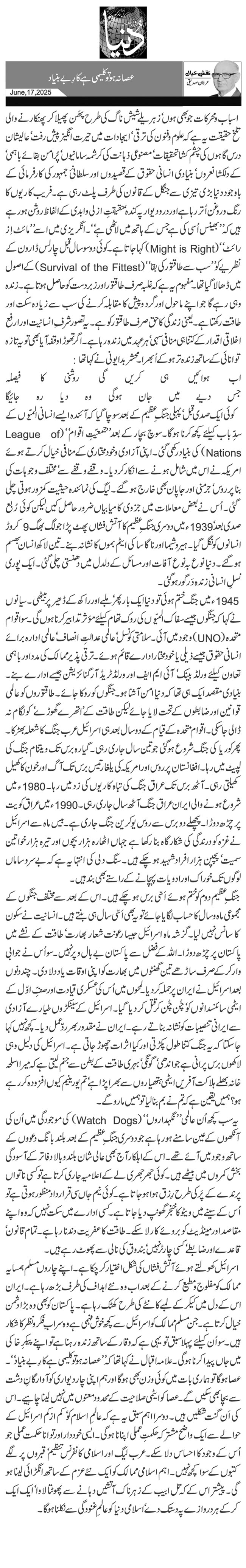 جنگِ عظیم دوم کو ختم ہوئے اَسّی برس ہو چکے ہیں۔ اس کے بعد سے مختلف جنگوں کے مجموعی ماہ وسال کا حساب لگایا جائے تو یہ بھی اَسّی سال ہی بنتے ہیں۔ انسانیت نے سکون کا سانس نہیں لیا۔ گزشہ ماہ اسرائیل جیسا رعونت شعار بھارت‘ طاقت کے نشے میں پاکستان پر چڑھ دوڑا۔ اللہ کے فضل سے پاکستان بے بال وپر نہیں۔ سو اُس نے جوابی وار کرکے صرف ساڑھے تین گھنٹوں میں بھارت کو ا پنی اوقات یاد دلا دی۔ چند دنوں بعد اسرائیل نے ایران پر حملہ کر دیا۔ لمحوں میں اُس کی عسکری قیادت اور صفِّ اوّل کے ایٹمی سائنسدانوں کو‘ چُن چُن کر قتل کر دیا گیا۔ اسرائیل کے سینکڑوں طیارے آزادی سے ایرانی تنصیبات کو نشانہ بناتے رہے۔ ایران نے مقدور بھر ردّعمل دیا۔ کچھ نہیں کہا جا سکتا کہ یہ جنگ کتنا طول پکڑتی اور کیا اثرات چھوڑ جاتی ہے۔ اسرائیل کی دلیل وہی لاکھوں برس پرانی ہے جو اندھی‘ گونگی‘ بہری طاقت کے بطن سے جنم لیتی ہے کہ میرا اسلحہ خانہ بھلے ہلاکت آفریں ایٹمی ہتھیاروں سے بھرا پڑا ہے‘ تم یورینیم کیوں افزودہ کر رہے ہو؟ ہمیں یقین ہے کہ تم نے بم بنا لیا تو ہمیں مارو گے۔