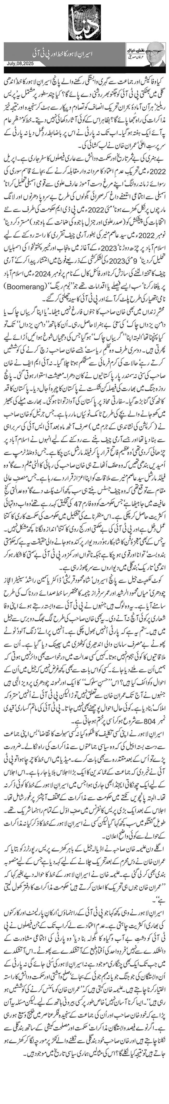 کیا وفا کیش اور جماعت سے گہری وابستگی رکھنے والے پانچ اسیرانِ لاہور کا خط‘ اندھی گلی میں بھٹکتی پی ٹی آئی کو جگنو بھر روشنی دے پائے گا؟ کیا چند سطور پر مشتمل یہ 'پریس ریلیز‘ ہرآن آمادۂ بحران تحریک انصاف کو تصادم وپیکار سے ہٹ کر سنجیدہ اور نتیجہ خیز مذاکرات کی راہ سُجھا پائے گا؟ بظاہر اس کے کوئی آثار دکھائی نہیں دیتے۔ خط کو منظرِ عام پہ آئے ایک ہفتہ ہو گیا۔ اب تک نہ پارٹی نے اس پر باضابطہ ردِعمل دیا نہ پارٹی کے سرپرستِ اعلیٰ‘ عمران خان نے لب کشائی کی۔