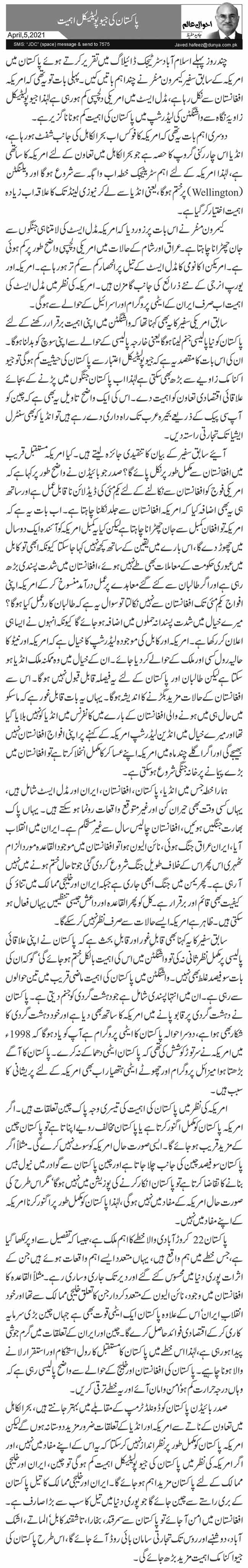 صدر بائیڈن پاکستان کو ڈونلڈ ٹرمپ کے مقابلے میں بہتر جانتے ہیں، بحرالکاہل میں تعاون کے ناتے سے امریکہ اور انڈیا کے تعلقات ضرور مزید دوستانہ ہوں گے لیکن امریکہ پاکستان کو مکمل طور پر نظر انداز نہیں کر سکتا کہ یہ اس کے اپنے مفاد میں نہیں، اور اگر امریکہ کی نظر میں پاکستان کی جیو پولیٹیکل اہمیت کم ہو گی تو چین، ایران اور خلیجی ممالک کے لئے پاکستان مزید اہم ہو جائے گا۔ ایران اور خلیجی ممالک کا تیل پاکستان کے بری راستے سے چین جائے گا جو پوری دنیا میں تیل کا سب سے بڑا صارف ہے۔ افغانستان میں امن آ جائے تو پاکستان سے سمرقند، بخارا، تاشقند کابل‘ الماتے، اشک آباد، دوشنبے اور روس تک تجارتی سامان بائی روڈ آئے جائے گا، اس طرح پاکستان کی جیو اکنامک اہمیت مزید بڑھ جائے گی۔
