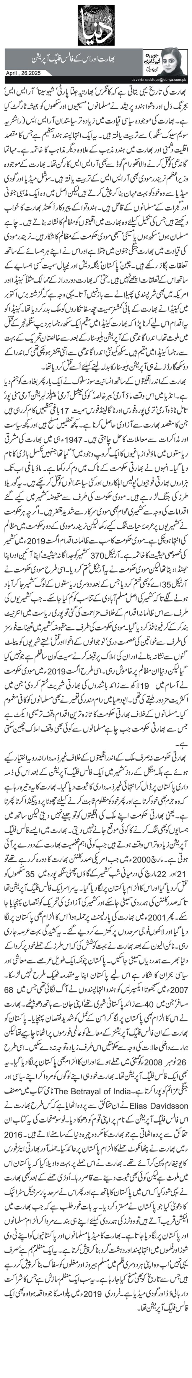 بھارتی حکومت نہ صرف ملک کے اندر اقلیتوں کے خلاف غیر ذمہ دارانہ رویہ اختیار کیے ہوئے ہے بلکہ منگل کے روز کشمیر میں ایک فالس فلیگ آپریشن کے بعد اس کی ذمہ داری پاکستان پر ڈال کر انتہائی غیر ذمہ داری کا ثبوت دیا گیا۔ بھارت کا یہ وتیرہ رہا ہے کہ وہ جرم بھی خود کرتا ہے اور پھر خود کو مظلوم ثابت کرنے کیلئے چھوٹا پروپیگنڈا کرتا پھرتا ہے۔ یعنی بھارتی حکومت اپنے ملک کی اقلیتوں کو تو جینے نہیں دیتی لیکن ساتھ میں ہمسایوں کو بھی تنگ کرنے کا کوئی موقع جانے نہیں دیتی۔ بھارت میں ایسے فالس فلیگ آپریشن زیادہ تر اس وقت ہوتے ہیں جب کوئی اہم شخصیت بھارت کے دورے پر آئی ہوتی ہے۔ مارچ 2000ء میں جب امریکی صدر کلنٹن بھارت کا دورہ کر رہے تھے تو 21 اور22 مارچ کی درمیانی شب کشمیر کے گاؤں چھٹی سنگھ پورہ میں 35 سکھوں کو قتل کردیا گیا اور اس کا الزام پاکستان پر لگادیا گیا۔ یہ سراسر ایک فالس فلیگ آپریشن تھا تاکہ صدر کلنٹن کی ہمدردی سمیٹی جاسکے اور کشمیر کی آزادی کی تحریک کو نقصان پہنچایا جا سکے۔ پھر 2001ء میں بھارت کی پارلیمنٹ پر حملہ ہوا‘ اس کا الزام بھی پاکستان پر لگا دیا گیا اور لاکھوں فوجی سرحدوں پر کھڑے کردیے گئے۔ یہ کشیدگی بہت عرصہ جاری رہی۔ نائن الیون کے بعد بھارت نے بہت کوشش کی کہ اس طرز کے حملے خود پر کرواکے دنیا بھر سے ہمدردیاں سمیٹی جاسکیں۔ پاکستان چونکہ ایک طویل عرصے سے معاشی اور سیاسی بحران کا شکار ہے اس لیے پاکستان اپنا یہ مقدمہ ٹھیک طرح نہیں لڑسکا۔ 2007ء میں سمجھوتا ایکسپریس کو ہندو انتہاپسندوں نے آگ لگائی تھی جس میں68 مسافر‘ جن میں 40 سے زائد پاکستانی شہری تھے‘ اپنی جان سے ہاتھ دھو بیٹھے۔بھارت نے اس کا الزام بھی پاکستان پر لگا کر امن کے عمل کو شدید نقصان پہنچایا۔ پاکستان کو بھارت کے ان فالس فلیگ آپریشنز کے معاملے کو عالمی فورموں پر اٹھانا چاہیے تھا لیکن ہمارے داخلی حالات کی وجہ سے حکومتیں اس طرف زیادہ توجہ نہ دے سکیں۔ اسی طرح 26 نومبر2008 ء کو ممبئی میں حملے ہوئے اوران کا الزام بھی پاکستان پر لگا دیا گیا۔ یہ بھی ایک فالس فلیگ آپریشن تھا۔بھارت خود ہی اپنے لوگوں کو مروا کر اپنے سیاسی اور جنگی عزائم کو پورا کرتا ہے۔ The Betrayal of India نامی کتاب میں مصنف Elias Davidsson نے ان حقائق سے پردہ اٹھایا ہے کہ کس طرح بھارت نے اس فالس فلیگ آپریشن کے نام پر اپنی قوم کو دھوکا دیا۔ نو سو صفحات کی یہ کتاب ان حقائق سے پردہ اٹھاتی ہے جو بھارت کا مکروہ چہرہ دنیا کے سامنے لاتے ہیں۔2016 ء میں بھارت نے پٹھانکوٹ حملے کا الزام پاکستان پر عائد کیا۔ حملہ آور بھارتی ایئرفورس کا یونیفارم پہن کر آئے تھے۔بھارت نے اس حملے پر بہت واویلا کیا کہ پاکستان اس میں ملوث ہے لیکن کوئی بھی ثبوت دینے سے قاصر رہا۔ اُوڑی حملے کے بعد بھی بھارت نے یہی شور کیا کہ اس میں پاکستان کا ہاتھ ہے اورپھر اس نے سرحد پار سرجیکل سٹرائیک کا دعویٰ کیا جو پاکستان نے مسترد کردیا۔ یہ بات غور طلب ہے کہ جب بھارت میں الیکشن قریب آتے ہیں تو ووٹرز کی ہمدردی کیلئے اپنے ہی بندے مروا کر الزام مسلمانوں اور پاکستان پر لگا دیا جاتا ہے۔ بھارت کا میڈیا مسلمانوں اور پاکستانیوں کو اپنے ٹی وی شوز اور فلموں میں انتہا پسند اور دہشت گرد بناکر پیش کرتا ہے۔ یہ ایک منظم مہم ہے‘ صرف یہی نہیں‘ اب وہ اپنی ہر دوسری فلم میں مسلم ہیروز اور مغلوں کو سفاک بنا کر پیش کررہے ہیں جس سے تاریخ کو بھی مسخ کیا جارہا ہے۔ یہ سب ایک منظم سازش ہے جس کا شراکت دار بالی وُڈ اور گودی میڈیا ہے۔ فروری 2019 ء میں پلوامہ کا جو واقعہ ہوا وہ بھی ایک فالس فلیگ آپریشن تھا۔