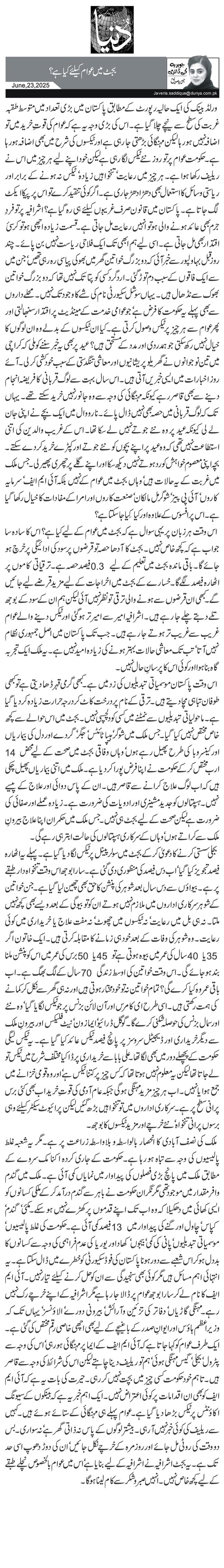 اس وقت ہر زبان پر یہی سوال ہے کہ بجٹ میں عوام کے لیے کیا ہے؟ اس کا سادہ سا جواب ہے کہ کچھ خاص نہیں۔ بجٹ کا آدھا حصہ تو قرضوں پر سود کی ادائیگی پر خرچ ہو جائے گا۔ باقی ماندہ بجٹ میں تعلیم کے لیے 0.3 فیصد حصہ ہے۔ ترقیاتی کاموں پر اٹھارہ فیصد لگے گا۔ خسارے کے بجٹ میں اخراجات کے لیے مزید قرضے لیے جائیں گے۔ کبھی ان قرضوں سے ہونے والی ترقی تو نظر نہیں آئی لیکن ہم ان کے سود کے بوجھ تلے دبتے چلے جا رہے ہیں۔ اشرافیہ امیر سے امیر تر ہو گئی اور ٹیکس دینے والے عوام غریب سے غریب تر ہوتے جا رہے ہیں۔ جب تک پاکستان میں اصل جمہوری نظام نہیں آتا‘ تب تک معاشی حالات بہتر ہونے کی زیادہ امید نہیں ہے۔ یہ ملک ایک تجربہ گاہ بنا ہوا اور کوئی اس کا پرسانِ حال نہیں۔