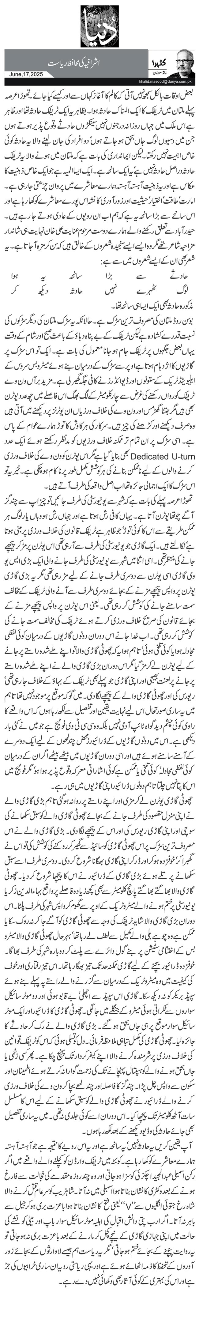 بوسن روڈ ملتان کی مصروف ترین سڑک ہے۔ حالانکہ یہ سڑک ملتان کی دیگر سڑکوں کی نسبت قدرے کشادہ ہے لیکن ٹریفک کے بے پناہ دباؤ کے باعث صبح اور شام کے وقت یہاں بعض جگہوں پر ٹریفک جام ہو جانا معمول کی بات ہے۔ ایک تو اس سڑک پر گاڑیوں کا اژدہام ہوتا ہے اوپر سے سڑک کے درمیان بنے ہوئے میٹرو بس سروس کے ایلیویٹڈ ٹریک کے ستونوں اور ڈیوائڈرز نے کافی جگہ گھیر لی ہے۔ مزید برآں ون وے ٹریفک کو رواں رکھنے کی غرض سے چار کلو میٹر کے لگ بھگ اس فاصلے میں چھ عدد یوٹرن بھی ہیں مگر جتنا گھڑمس اور ون وے کی خلاف ورزیاں ان یوٹرنز پر دیکھنے میں آتی ہیں وہ صرف دیکھنے اور کڑھنے کی چیز ہیں۔ سرکار کی ہر کاوش کا توڑ ہمارے عوام کے پاس ہے۔ اسی سڑک پر ان تمام تر ممکنہ خلاف ورزیوں کو مدنظر رکھتے ہوئے ایک عدد Dedicated U-turn بھی بنایا گیا ہے مگر اس یوٹرن کو ون وے کی خلاف ورزی کرنے والوں کے لیے ناممکن بنانے کی ہر کوشش مکمل طور پر ناکام ہو چکی ہے۔ خیر یہ تو اس سڑک کا ایک اجمالی جائزہ تھا اب اصل واقعہ کی طرف آتے ہیں۔