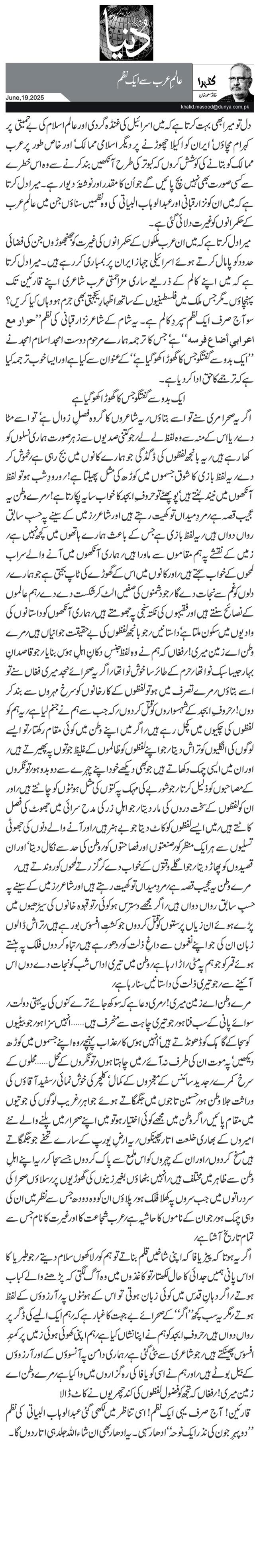 دل تو میرا بھی بہت کرتا ہے کہ میں اسرائیل کی غنڈہ گردی اور عالم اسلام کی بے حمیتی پر کہرام مچاؤں‘ ایران کو اکیلا چھوڑنے پر دیگر اسلامی ممالک‘ اور خاص طور پر عرب ممالک کو بتانے کی کوشش کروں کہ کبوتر کی طرح آنکھیں بند کرنے سے وہ اس خطرے سے کسی صورت بھی نہیں بچ پائیں گے جو اُن کا مقدر اور نوشتۂ دیوار ہے۔ میرا دل کرتا ہے کہ میں ان کو نزار قبانی اور عبدالوہاب البیاتی کی وہ نظمیں سناؤں جن میں عالمِ عرب کے حکمرانوں کو غیرت دلائی گئی ہے۔