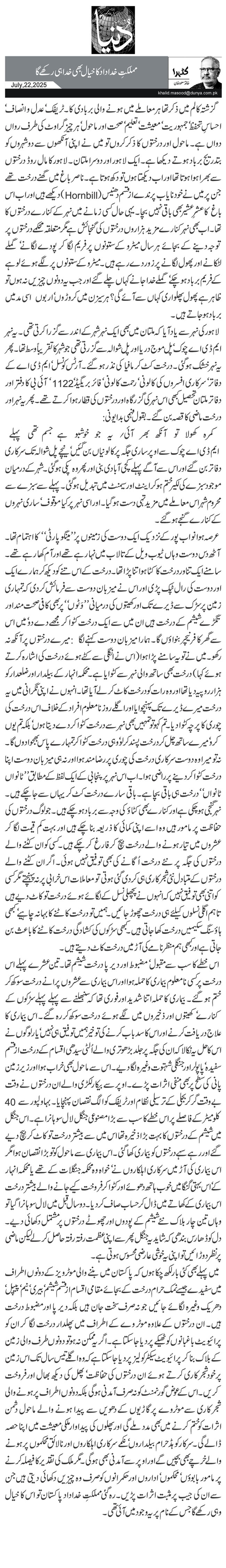 گزشتہ کالم میں ذکر تھا ہر معاملے میں ہونے والی بربادی کا۔ ٹریفک‘ عدل و انصاف‘ احساسِ تحفظ‘ جمہوریت‘ معیشت‘ تعلیم‘ صحت اور ماحول‘ ہر چیز گراوٹ کی طرف رواں دواں ہے۔ ماحول اور درختوں کا ذکر کروں تو میں نے اپنی آنکھوں سے دو شہروں کو بتدریج برباد ہوتے دیکھا ہے۔ ایک لاہور اور دوسرا ملتان۔ لاہور کا مال روڈ درختوں سے بھرا ہوا ہوتا تھا اور اب دیکھتا ہوں تو دکھ ہوتا ہے۔ ناصر باغ میں گھنے درخت تھے جن پر میں نے خود نایاب پرندے از قسم دھنیس (Hornbill) دیکھے ہیں اور اب اس باغ کا عشرِ عشیر بھی باقی نہیں بچا۔ یہی حال کسی زمانے میں نہر کے کنارے درختوں کا تھا۔ اب بھی نہر کنارے مزید ہزاروں درختوں کی گنجائش ہے مگر متعلقہ محکمے درختوں پر توجہ دینے کے بجائے ہر سال میٹرو کے ستونوں پر فریم لگا کر پودے لگانے‘ گملے لٹکانے اور پھول لگانے پر زور دے رہے ہیں۔ میٹرو کے ستونوں پر لگے ہوئے لوہے کے فریم برباد ہو چکے‘ گملے خدا جانے کہاں چلے گئے اور جب یہ دونوں چیزیں نہ ہوں تو ظاہر ہے پھول پھلواری کہاں سے آئے گی؟ ہر سیزن میں کروڑوں‘ اربوں اسی مد میں برباد ہو جاتے ہیں۔