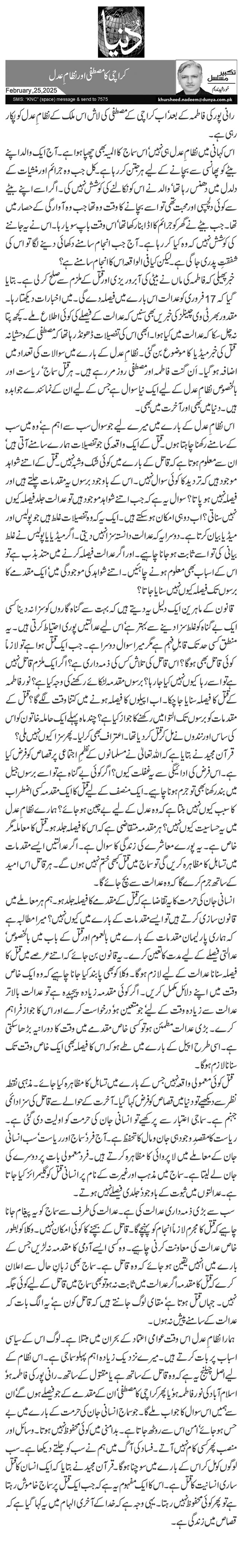 قرآن مجید نے بتایا ہے کہ اللہ تعالیٰ نے مسلمانوں کے نظمِ اجتماعی پر قصاص کو فرض کیا ہے۔ اس فرض کی ادائیگی سے یہ غفلت کیوں؟ اگر کوئی بے گناہ ہے تو اسے برسوں جیل میں بند رکھنا بھی تو جرم ہونا چاہیے۔ ایک منصف کے لیے قتل کا ایک مقدمہ کسی اضطراب کا سبب کیوں نہیں بنتا ہے کہ وہ عدل کے لیے بے چین ہو جائے؟ ہمارے نظامِ عدل میں یہ حساسیت کیوں نہیں؟ ہر مقدمہ متقاضی ہے کہ اس کا فیصلہ جلد ہو۔ قتل کا معاملہ مگر خاص ہے۔ یہ پورے معاشرے کی زندگی کا سوال ہے۔ اگر عدالتیں ایسے مقدمات میں تساہل کا مظاہرہ کریں گی تو سماج میں قتل کبھی ختم نہیں ہوں گے۔ ہر قاتل اس امید کے ساتھ جرم کرے گا کہ وہ عدالت سے بچ جائے گا۔