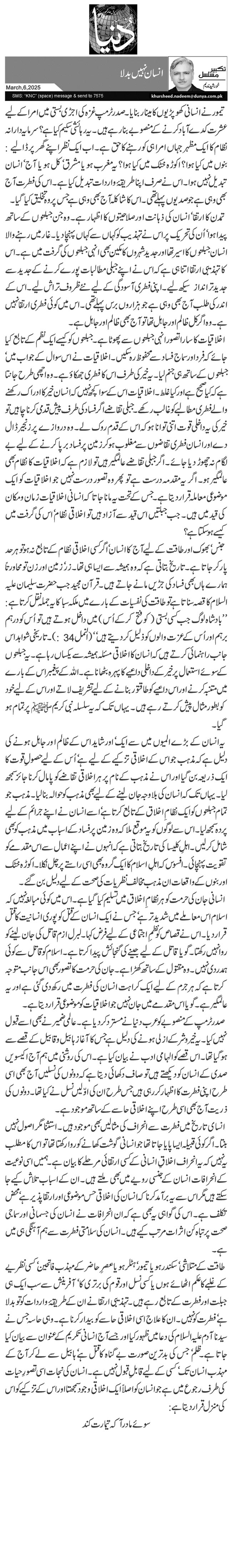 تیمور نے انسانی کھوپڑیوں کا مینار بنایا۔ صدر ٹرمپ غزہ کی اجڑی بستی میں امرا کے لیے عشرت کدے آباد کرنے کے منصوبے بنا رہے ہیں۔ یہ رہائشی سکیم کیا ہے؟ سرمایہ دارانہ نظام کا ایک مظہر جہاں امرا ہی کو رہنے کا حق ہے۔ اب ایک نظر اپنے گھر پر ڈالیے: بنوں میں کیا ہوا؟ اکوڑہ خٹک میں کیا ہوا؟ یہ مغرب ہو یا مشرق‘ کل ہو یا آج‘ انسان تبدیل نہیں ہوا۔ اس نے صرف اپنا طریقۂ واردات تبدیل کیا ہے۔ اس کی فطرت آج بھی وہی ہے جو صدیوں پہلے تھی۔ اس کا شاکلہ آج بھی وہی ہے جس پر وہ تخلیق کیا گیا۔