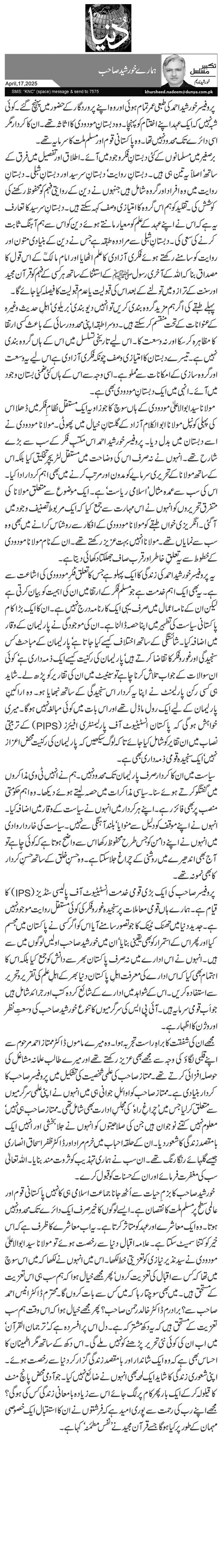 پروفیسر صاحب کی ایک بڑی قومی خدمت انسٹیٹیوٹ آف پالیسی سٹڈیز (IPS) کا قیام ہے۔ ہمارے ہاں قومی معاملات پر سنجیدہ غور و فکر کی کوئی مستقل روایت موجود نہیں ہے۔ جدید دنیا میں تھنک ٹینک کا جو تصور سامنے آیا اس کو اگر کسی نے پاکستان میں مجسم کیا اور پھر اس کے استمرار کو بھی یقینی بنایا‘ ان میں خورشید صاحب اولیں لوگوں میں سے ہیں۔ انہوں نے اس ادارے میں نہ صرف پاکستان بھر سے دانش کو جمع کیا بلکہ اس کا اہتمام بھی کیا کہ اس ادارے کی معرفت اہلِ پاکستان دنیا بھر کے اہلِ علم کی تقریر و تحریر سے استفادہ کریں۔ اس کے شواہد میں ادارے کے شائع کردہ کتب اور جرائد شامل ہیں جو اَب قومی سرمایہ ہیں۔ آئی پی ایس کی سرگرمیوں کا تنوع خورشید صاحب کی وسعتِ نظر اور وژن کا اظہار ہے۔