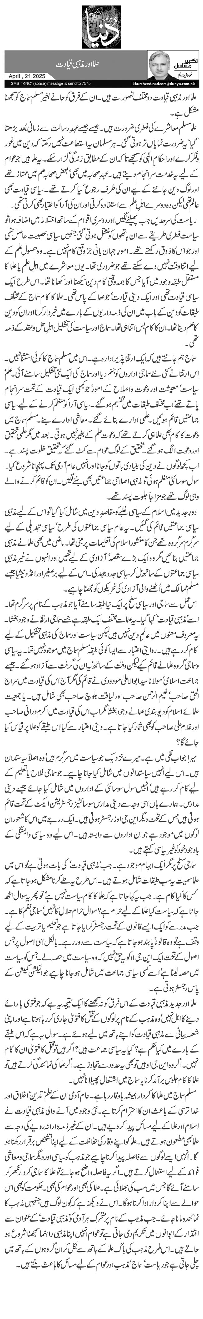 اس عمل سے سماجی اور سیاسی سطح پر ایک نیا طبقہ سامنے آیا جو مذہب کے نام پر سرگرم تھا۔ اسے 'مذہبی قیادت‘ کہا گیا۔ یہ علما سے مختلف ایک طبقہ ہے جسے سماجی ارتقا نے وجود بخشا۔ یہ معروف معنوں میں عالمِ دین نہیں ہیں لیکن سیاست اور سماج کی مذہبی تشکیل کے لیے کام کر رہے ہیں۔ روایتی اعتبار سے ایسا کوئی طبقہ مسلم سماج میں موجود نہیں تھا۔ یہ سیاسی وسماجی گروہ علما نے قائم کیے لیکن وقت کے ساتھ‘ یہ ان کی گرفت سے آزاد ہو گئے۔ جیسے جماعت اسلامی‘ مولانا سید ابوالاعلیٰ مودودی نے قائم کی مگر آج اس کی قیادت میں سراج الحق صاحب‘ نعیم الرحمن صاحب اور لیاقت بلوچ صاحب بھی شامل ہیں۔ یا جمعیت علمائے اسلام کو دیوبندی علمانے وجود بخشا مگر اب اس کی قیادت میں اکرم درانی صاحب اور غلام علی صاحب کو بھی شمار کیا جاتا ہے۔ دینی اعتبار سے کیا اس طبقے کو علما پر قیاس کیا جائے گا؟