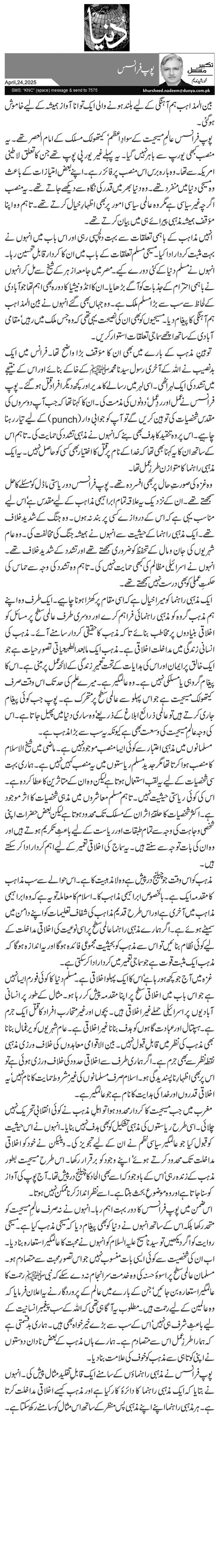 پوپ فرانسس عالمِ مسیحیت کے سوادِ اعظم‘ کیتھولک مسلک کے امام العصر تھے۔ یہ منصب کبھی یورپ سے باہر نہیں گیا۔ یہ پہلے غیر یورپی پوپ تھے جن کا تعلق لاطینی امریکہ سے تھا۔ وہ بارہ برس اس منصب پر فائز رہے۔ اپنے بعض امتیازات کے باعث وہ مسیحی دنیا میں منفرد تھے۔ وہ دنیا بھر میں قدر کی نگاہ سے دیکھے جاتے تھے۔ یہ منصب اگرچہ غیر سیاسی ہے مگر وہ عالمی سیاسی امور پر بھی اظہارِ خیال کرتے تھے۔ تاہم وہ اپنا مؤقف ہمیشہ مذہبی پیرائے ہی میں بیان کرتے تھے۔
