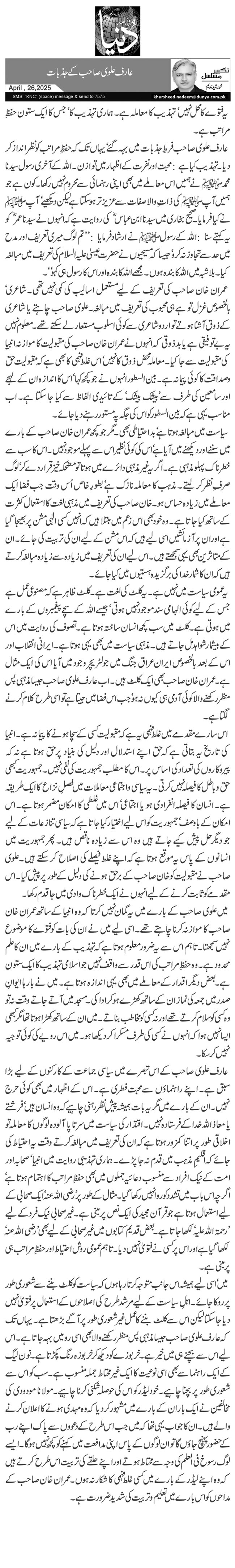 میں علوی صاحب کے بارے میں یہ گمان نہیں کرتا کہ وہ انبیا کے ساتھ عمران خان صاحب کا موازنہ کرنا چاہتے تھے۔ اسی لیے میں نے ان کی بات کو فتوے کا موضوع نہیں سمجھتا۔ تاہم اس سے یہ ضرور معلوم ہوتا ہے کہ تہذیب کے بارے میں ان کا علم محدود ہے۔ وہ حفظِ مراتب کی اس قدر سے واقف نہیں جو اسلامی تہذیب کا ایک ستون ہے۔ بعض دیگر اقدار کے معاملے میں بھی یہی اندازہ ہوتا ہے۔ میں نے بارہا ایوانِ صدر میں جمعہ کی نماز ان کے ساتھ کھڑے ہو کر ادا کی۔ مسجد میں آتے جاتے وقت نہ تو وہ کسی کو سلام کرتے تھے اور نہ کسی کو مخاطب بناتے۔ میں ان کے ساتھ کھڑا ہوتا تھا مگر کبھی ایسا نہیں ہوا کہ انہوں نے کسی کی طرف مسکرا کر دیکھا ہو۔ میں اس رویے کی کوئی توجیہ نہیں کر سکا۔