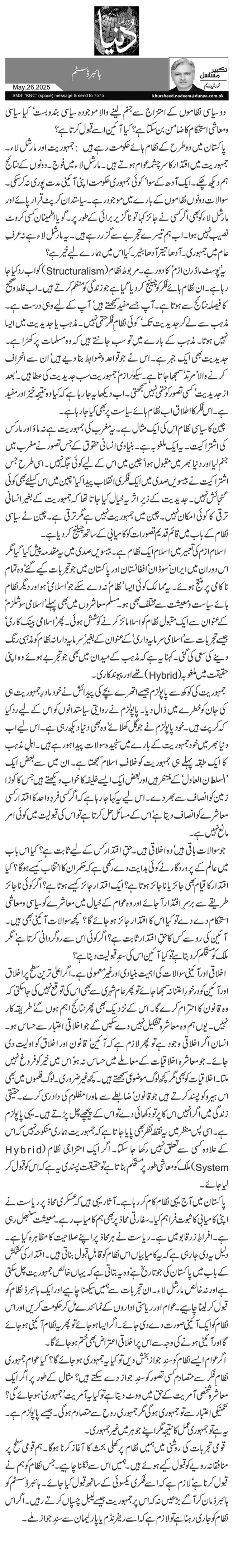 پاکستان میں آج یہی نظام کام کر رہا ہے۔ آثار یہی ہیں کہ عسکری محاذ پر ریاست نے اپنی کامیابی کا ثبوت فراہم کیا۔ سفارتی محاذ پر بھی ہم کامیاب رہے۔ معیشت سنبھل رہی ہے۔ افراطِ زر قابو میں ہے۔ ریاست نے ہر محاذ پر اپنے صلاحیت کا مظاہرہ کیا ہے۔ دلیل یہ دی جا رہی ہے کہ یہ کامیابیاں اس نظام کو قابلِ قبول بناتی ہیں۔ اقتدار کی کشمکش کے باب میں پاکستان کی جو تاریخ ہے‘ وہ یہ بتاتی ہے کہ یہاں خالص جمہوریت چل سکتی ہے اور نہ خالص مارشل لاء۔ ان تجربات سے ہمیں سیکھنا چاہیے اور ایک ہائبرڈ نظام کو قبول کر لینا چاہیے۔ عوام اور ریاستی اداروں کے نمائندے مل کر حکومت کریں اور اس نظام کو ایک آئینی صورت دے دی جائے۔ اگر ایسا ہو جائے تو پھر یہ نظام آئینی ہو جائے گا اور آئینی ہونے کی وجہ سے اس پر اخلاقی اعتراض بھی ختم ہو جائے گا۔