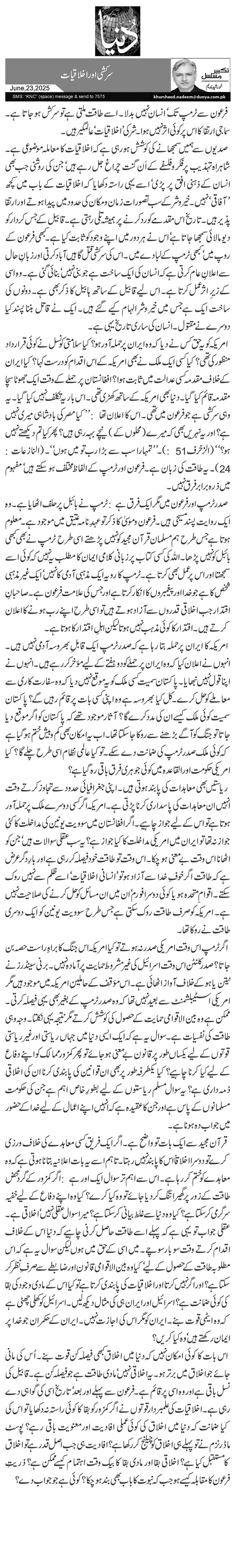 امریکہ کو یہ حق کس نے دیا کہ وہ ایران پر حملہ آور ہو؟ کیا سلامتی کونسل نے کوئی قرارداد منظور کی تھی؟ کیا کسی ایک ملک نے بھی امریکہ کے اس اقدام کو درست کہا؟ کیا ایران کے خلاف مقدمہ کسی عدالت میں ثابت ہوا؟ افغانستان پر حملے کے وقت ایک جھوٹا سچا مقدمہ قائم کیا گیا۔ دنیا بھی امریکہ کے ساتھ کھڑی تھی۔ اس بار یہ تکلف نہیں کیا گیا۔ یہ وہی سرکشی ہے جو فرعون میں تھی۔ اس کا اعلان تھا: ''کیا مصر کی بادشاہی میری نہیں ہے؟ اور یہ نہریں بھی کہ میرے (محلوں کے) نیچے بہہ رہی ہیں؟ پھر کیا تم دیکھتے نہیں ہو؟‘‘ (الزخرف: 51)۔ ''تمہارا سب سے بڑا رب تو میں ہوں‘‘۔ (النازعات: 24)۔ یہ طاقت کی زبان ہے۔ فرعون اور ٹرمپ کے الفاظ مختلف ہو سکتے ہیں‘ مفہوم میں ذرہ برابر فرق نہیں۔