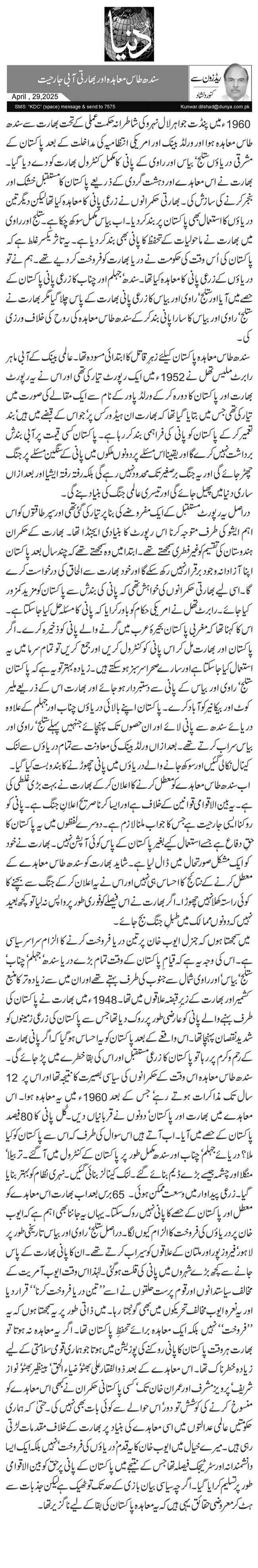 اب سندھ طاس معاہدے کو معطل کرنے کا اعلان کر کے بھارت نے بہت بڑی غلطی کی ہے۔ یہ بین الاقوامی قوانین کے خلاف ہے اور ایسا کرنا صریح اعلانِ جنگ ہے۔ پانی کو روکنا ایسی جارحیت ہے جس کا جواب ملنا لازم ہے۔ دوسرے لفظوں میں یہ پاکستان کا حقِ دفاع ہے جسے استعمال کیے بغیر پاکستان کے پاس کوئی آپشن نہیں۔ بھارت نے خود کو ایک مشکل صورتحال میں ڈال لیا ہے۔ شاید بھارت کو سندھ طاس معاہدے کے معطل کرنے کے نتائج کا احساس ہی نہیں اور اس نے یہ اعلان کر کے جنگ سے بچنے کا کوئی راستہ کھلا نہیں چھوڑا۔ اگر بھارت نے اس فیصلے کو فوری طور پر واپس نہ لیا تو کچھ بعید نہیں کہ دونوں ممالک میں طبلِ جنگ بج جائے۔
