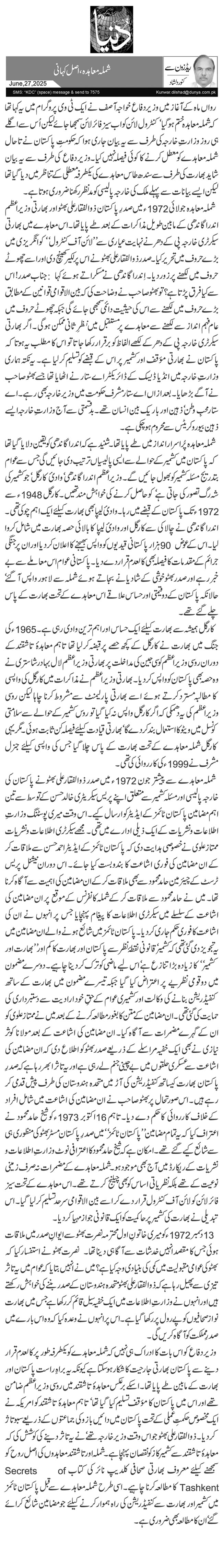 وزیر دفاع کو اس بات کا ادراک ہی نہیں کہ شملہ معاہدے کو یکطرفہ طور پر کالعدم قرار دینے سے پاکستان بھارتی جارحیت کا شکار ہو سکتا ہے کیونکہ یہ براہِ راست پاکستان اور بھارت کے مابین طے پایا تھا۔ اسکے برعکس معاہدۂ تاشقند میں روسی وزیراعظم ضامن تھے اور اس میں پاکستان کا مؤقف تسلیم کیا گیا تھا‘ تاہم معاہدۂ تاشقند کو امریکہ نے ایک مخصوص حکمتِ عملی کے تحت پاکستان میں دائیں بازو کی جماعتوں کے ذریعے سبوتاژ کر دیا۔ ذوالفقار علی بھٹو جو اس وقت وزیر خارجہ تھے‘ نے یہ تاثر دینے کی کوشش کی کہ معاہدۂ تاشقند سے کشمیر کاز کو نقصان پہنچا ہے۔ شملہ اور تاشقند معاہدوں کی اصل روح کو سمجھنے کیلئے معروف بھارتی صحافی کلدیپ نائر کی کتاب Secrets of Tashkent کا مطالعہ کرنا چاہیے۔ اسی طرح شملہ معاہدے سے قبل پاکستان ٹائمز میں کشمیر اور بھارت سے کنفیڈریشن کی راہ ہموار کرنے کیلئے جو مضامین شائع کرائے گئے‘ ان کا مطالعہ بھی ضروری ہے۔