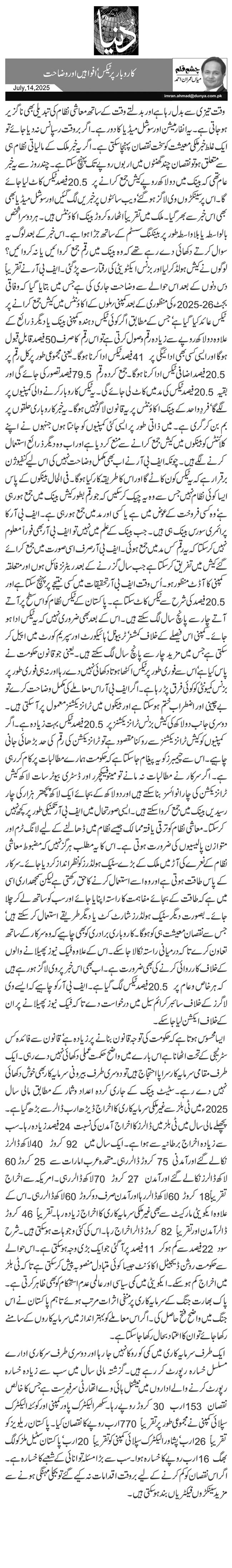 وقت تیزی سے بدل رہا ہے اور بدلتے وقت کے ساتھ معاشی نظام کی تبدیلی بھی ناگزیر ہو جاتی ہے۔ یہ انفارمیشن اور سوشل میڈیا کا دور ہے۔ اگر بروقت رسپانس نہ دیا جائے تو ایک غلط خبر ملکی معیشت کو سخت نقصان پہنچا سکتی ہے۔ اگر یہ خبر ملک کے مالیاتی نظام ہی سے متعلق ہو تو نقصان چند گھنٹوں میں اربوں روپے تک پہنچ سکتا ہے۔ چند روز سے یہ خبر عام تھی کہ بینک میں دو لاکھ روپے کیش جمع کرانے پر 20.5 فیصد ٹیکس کاٹ لیا جائے گا۔ اس پر سینکڑوں وی لاگز ہو گئے‘ ویب سائٹوں پر خبریں لگ گئیں اور سوشل میڈیا بھی بھی اس خبر سے بھر گیا۔ ملک میں تقریباً اٹھارہ کروڑ بینک اکائونٹس ہیں۔ ہر دوسرا شخص بالواسطہ یا بلاواسطہ طور پر بینکنگ سسٹم کے ساتھ جڑا ہوا ہے۔ اس خبر کے بعد لوگ یہ سوال کرتے دکھائی دے رہے تھے کہ وہ بینک میں رقم جمع کروائیں یا نہ کروائیں؟ لوگوں نے کیش ہولڈ کر لیا اور بزنس ایکٹویٹی کی رفتار سست پڑ گئی۔ ایف بی آر نے تقریباً دس دنوں کے بعد اس حوالے سے وضاحت جاری کی ہے جس میں بتایا گیا کہ وفاقی بجٹ 2025-26ء کی منظوری کے بعد کمپنی؍ ملوں کے اکائونٹس میں کیش جمع کرانے پر ٹیکس عائد کیا گیا ہے‘ جس کے مطابق اگر کوئی ٹیکس دہندہ کمپنی بینک یا دیگر ذرائع کے علاوہ دو لاکھ روپے سے زیادہ رقم وصول کرتی ہے تو اس رقم کا صرف 50فیصد قابلِ قبول ہو گا اور ایسی کسی بھی ادائیگی پر 41 فیصد ٹیکس ادا کرنا ہو گا۔ یعنی مجموعی طور پر کل رقم پر 20.5 فیصد اضافی ٹیکس ادا کرنا ہو گا۔ جمع کردہ رقم 79.5 فیصد تصور کی جائے گی اور بقیہ 20.5 فیصد ٹیکس کی مد میں کاٹ لی جائے گی۔ یہ ٹیکس کاروبار کرنے والی کمپنیوں پر لگے گا‘ فردِ واحد کے بینک اکائونٹس پر یہ قانون لاگو نہیں ہو گا۔ یہ خبر کاروباری حلقوں پر بم بن کر گری ہے۔ میں ذاتی طور پر ایسی کئی کمپنیوں کو جانتا ہوں جنہوں نے اپنے کلائنٹس کو بینکوں میں کیش جمع کرانے سے منع کر دیا ہے اور اب وہ دیگر ذرائع استعمال کرنے لگے ہیں۔ چونکہ ایف بی آر نے اب بھی مکمل وضاحت نہیں کی اس لیے کنفیوژن برقرار ہے کہ یہ ٹیکس کون کاٹے گا اور اس کا طریقہ کار کیا ہو گا۔ فی الحال بینکوں کے پاس ایسا کوئی نظام نہیں جس سے وہ یہ چیک کر سکیں کہ جو رقم بطور کیش بینک میں جمع ہو رہی ہے‘ وہ کسی فروخت کے عوض میں ہے یا کسی اور مد میں جمع ہو رہی ہے۔ ایف بی آر کا پرائمری سورس بینک ہی ہیں۔ جب بینک کے علم میں نہیں تو ایف بی آر بھی فوراً معلوم نہیں کر سکتا کہ یہ رقم کس مد میں جمع ہوئی۔ ایف بی آر صرف اسی صورت میں جمع کرائے گئے کیش میں تفریق کر سکتا ہے جب سال گزرنے کے بعد ریٹرنز فائل ہوں اور متعلقہ کمپنی کا آڈٹ منظور ہو۔ اُس وقت ایف بی آر تحقیقات میں کسی نتیجے پر پہنچ سکتا ہے اور 20.5 فیصد کی شرح سے ٹیکس کاٹ سکتا ہے۔ پاکستان کے ٹیکس نظام کو اس سطح پر آتے آتے چار سے پانچ سال لگ سکتے ہیں۔ اس کے بعد بھی ضروری نہیں کہ یہ ٹیکس ادا ہو جائے۔ کمپنی اس فیصلے کے خلاف کمشنر‘ ٹربیونل‘ ہائیکورٹ اور سپریم کورٹ میں اپیل کر سکتی ہے جس میں مزید چار سے پانچ سال لگ سکتے ہیں۔ یعنی جو قانون حکومت نے پاس کیا ہے‘ اس سے فوری طور پر ٹیکس اکٹھا ہوتا دکھائی نہیں دے رہا اور نہ ہی فوری طور پر بزنس کمیونٹی کو کوئی فرق پڑ رہا ہے۔ اگر ایف بی آر اس معاملے کی مکمل وضاحت کرے تو بے چینی اور اضطراب ختم ہو سکتا ہے اور بینکوں میں ٹرانزیکشنز معمول پر آ سکتی ہیں۔ دوسری جانب دو لاکھ کی کیش بزنس ٹرانزیکشنز پر 20.5 فیصد ٹیکس بہت زیادہ ہے۔ اگر کمپنیوں کو کیش ٹرانزیکشنز سے روکنا مقصود ہے تو ٹرانزیکشن کی رقم کی حد بڑھائی جانی چاہیے۔ اس سے چیمبرز کو یہ پیغام جا سکتا ہے کہ حکومت ہمارے مطالبات پر کام کر رہی ہے۔ اگر سرکار نے مطالبات نہ مانے تو مینوفیکچرر اور ڈسٹری بیوٹر سات لاکھ کیش ٹرانزیکشن کی چار انوائسز بنا سکتے ہیں اور دو لاکھ کے بجائے ایک لاکھ پچھتر ہزار کی چار رسیدیں بینک میں جمع کروا سکتے ہیں۔ ایسی صورتحال میں ایف بی آر تکنیکی طور پر کچھ نہیں کر سکتا۔ معاشی نظام کو ترقی یافتہ ممالک جیسے نظام میں ڈھالنے کے لیے لانگ ٹرم اور متوازن پالیسی