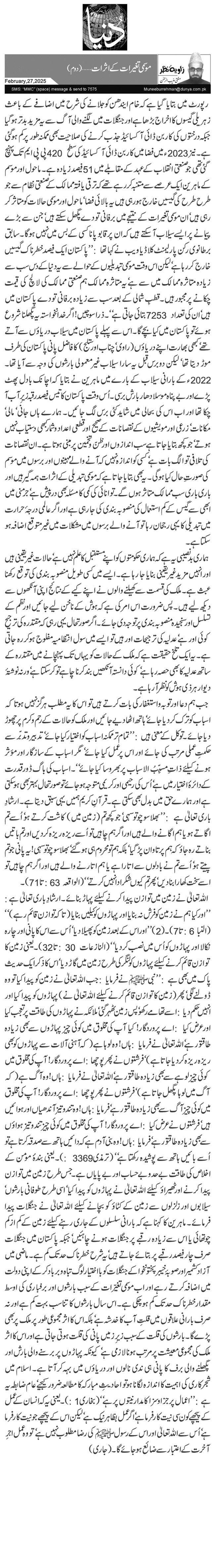رپورٹ میں بتایا گیا ہے کہ خام ایندھن کو جلانے کی شرح میں اضافے کے باعث زہریلی گیسوں کا اخراج بڑھا ہے اور جنگلات میں لگنے والی آگ سے یہ مزید بدتر ہوگیا جبکہ درختوں کی کاربن ڈائی آکسائیڈ جذب کرنے کی صلاحیت بھی ممکنہ طور پرکم ہوگئی ہے۔ نیز 2023ء میں فضا میں کاربن ڈائی آکسائیڈ کی سطح 420 پی پی ایم تک پہنچ گئی تھی جو صنعتی انقلاب کے عہد کے مقابلے میں 51فیصد زیادہ ہے۔ ماحول اور موسم کے ماہرین ایک عرصے سے متنبہ کر رہے تھے کہ ترقی یافتہ ممالک کے صنعتی نظام سے جو طرح طرح کی گیسیں خارج ہو رہی ہیں یہ بالائی فضا‘ ماحول اور موسمی حالات کو متاثر کر رہی ہیں‘ ان موسمی تغیرات کے نتیجے میں برفانی تودے پگھل سکتے ہیں‘ جن سے بڑے پیمانے پر ایسے سیلاب آ سکتے ہیں کہ ان پر قابو پانا کسی کے بس میں نہیں ہو گا۔ سابق برطانوی رکن پارلیمنٹ کلاڈیا ویب نے کہا تھا: ''پاکستان ایک فیصد خطرناک گیسیں خارج کر رہا ہے‘ لیکن اس وقت موسمی تبدیلیوں کے حوالے سے یہ دنیا کے دس سب سے زیادہ متاثرہ ممالک میں سے ہے‘ یہ متاثرہ ممالک ہم صنعتی ممالک کی لالچ کی قیمت چکانے پر مجبور ہیں۔ قطبِ شمالی کے بعد سب سے زیادہ برفانی تودے پاکستان میں ہیں‘ ان کی تعداد 7253 بتائی جاتی ہے‘‘۔ ذرا سوچیں! اگر خدانخواستہ یہ پگھلنا شروع ہوئے تو پاکستان میں کیا بچے گا۔ اس سے پہلے پاکستان میں سیلاب دریائوں سے آتے تھے‘ کبھی بھارت اپنے دریائوں (راوی‘ چناب اور ستلج) کا فاضل پانی پاکستان کی طرف موڑ دیتا تھا‘ لیکن دوبرس قبل یہ سارا سیلاب غیر معمولی بارشوں کی وجہ سے آیا تھا۔ 2022ء کے بارانی سیلاب کے بارے میں ماہرین نے بتایا کہ اچانک بادل پھٹ پڑے اور بے پناہ موسلادھار بارش برسی۔ اُس وقت پاکستان کا تیس فیصد رقبہ زیرِ آب آ چکا تھا اور اب اس کی بحالی میں شاید کئی برس لگ جائیں۔ ہمارے ہاں جانی‘ مالی‘ مکانات‘ زرعی اور مویشیوں کے نقصانات کے صحیح اور قطعی اعداد وشمارکبھی دستیاب نہیں ہوتے‘ جو کچھ بتایا جاتا ہے سب اندازوں اور ظنّ وتخمین پر مبنی ہوتا ہے۔ ان نقصانات کی تلافی تو الگ بات ہے‘ کسی کو اندازہ نہیں کہ آنے والے مہینوں اور برسوں میں موسم کی صورتِ حال کیا ہو گی۔ یہ بھی بتایا جاتا ہے کہ موسمی تبدیلی کے اثرات ہمہ گیر ہیں اور باری باری سب ممالک متاثر ہوں گے۔ توانائی کی کمی کا مسئلہ بھی درپیش ہے‘ جرمنی میں ابھی سے گیس کے کم استعمال کی منصوبہ بندی کی جا رہی ہے اور اگر عالمی درجۂ حرارت میں تبدیلی کا یہی رجحان رہا تو آنے والے برسوں میں مشکلات میں غیر متوقع اضافہ ہو سکتا ہے۔